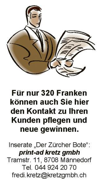 Inseraten-Annahme: print-ad kretz gmbh Fredi Kretz Tramstrasse 11, Postfach, 8708 Männedorf Tel 044 924 20 70 Fax 044 924 20 79 inserate@zuercher-bote ch
