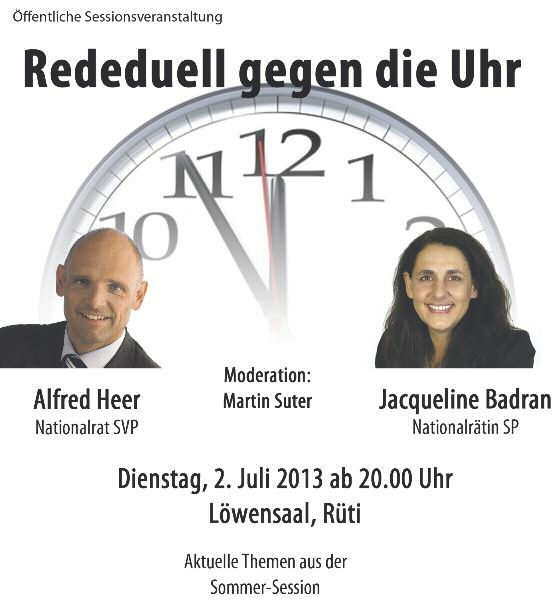 Samstag, 13 Juli 2013, 10 00 Uhr, Restaurant Sorriso, Glattalstrasse 182, Rümlang, 19 Politstamm mit der Gemeinderätin Michaela Oberli und dem Gemeinderat Peter Meier Sie sprechen zum Thema «Spannungsfeld Gemeinderat – Beruf oder Berufung»