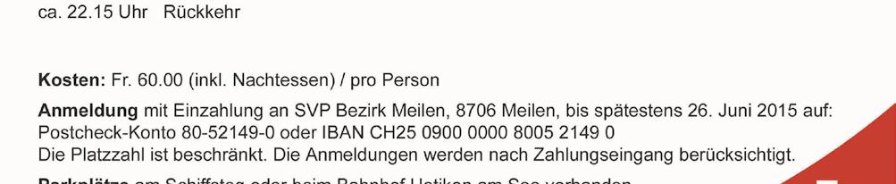 Schifffahrt mit Ständeratskandidat HansUeli Vogt. Kosten: Fr. 60.– (inkl. Nachtessen) / pro Person. Anmeldung mit Einzahlung bis spätestens 26. Juni 2015 auf: PCKonto 80-52149-0, IBAN CH25 0900 0000 8005 2149 0. Parkplätze am Schiffsteg oder beim Bahnhof Uetikon am See.