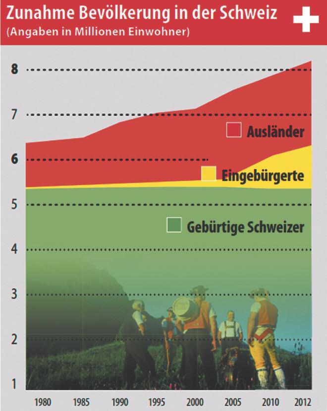 Folgen der Massenzuwanderung Die Boden- und Mietzinse explodieren, die Infrastrukturen sind überlastet Eine Kulturland- oder eine Zweitwohnungsinitiative, um nur zwei Beispiele zu nennen, hätten vor der Personenfreizügigkeit mit anschliessender Masseneinwanderung keine Chance gehabt Solche Vorstösse führen zu mehr Regulierungen und weniger Freiheit in unserem Land Aufgrund dieser Entwicklung sehe ich als Unternehmer klar, dass heute die Nachteile grösser sind als die Vorteile, die es selbstverständlich mit dem Zugriff auf 550 Millionen EU-Bürger auch gibt Es gibt mir zu denken, wenn Wirtschaftsfunktionäre im Hinblick auf die Abstimmung vom 9 Februar 2014 Märchen erzählen im Stil der Jungsozialisten bei der 1:12-Initiative Economiesuisse behauptete in Inseraten und in sonstigen Publikationen, dass das Wirtschaftswachstum pro Kopf (qualitatives Wachstum) der