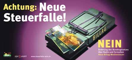 Am 14. Juni 2015 stimmen wir über die Revision des Radio- und Fernsehgesetzes (RTVG) ab. Mit dieser will der Staat für alle Haushalte und Firmen eine neue Billag-Mediensteuer einführen. Egal, ob jemand Empfangsgeräte hat, egal, ob er Radio und TV konsumiert, ja selbst egal, ob er überhaupt in der Lage ist, die Programme zu hören oder zu sehen. Alle müssen für das Staatsfernsehen zahlen. Alle werden abgezockt.