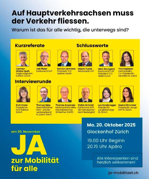 Montag, 13 Oktober 2025, 19 00 Uhr, Podium zur Verkehrspolitik, Zentrum Glockenhof, Sihlstrasse 33, Zürich, mit Bundesrat Albert Rösti und Nationalrat Mauro Tuena. Anschliessend Apéro.