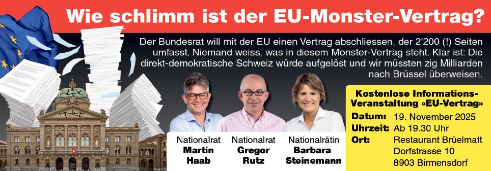 Mittwoch, 19 November 2025, 19 30 Uhr, Infoanlass zum Rahmenabkommen, Restaurant Brüelmatt, Dorfstrasse 10, Birmensdorf, mit den Nationalräten Barbara Steinemann, Gregor Rutz und Martin Haab.