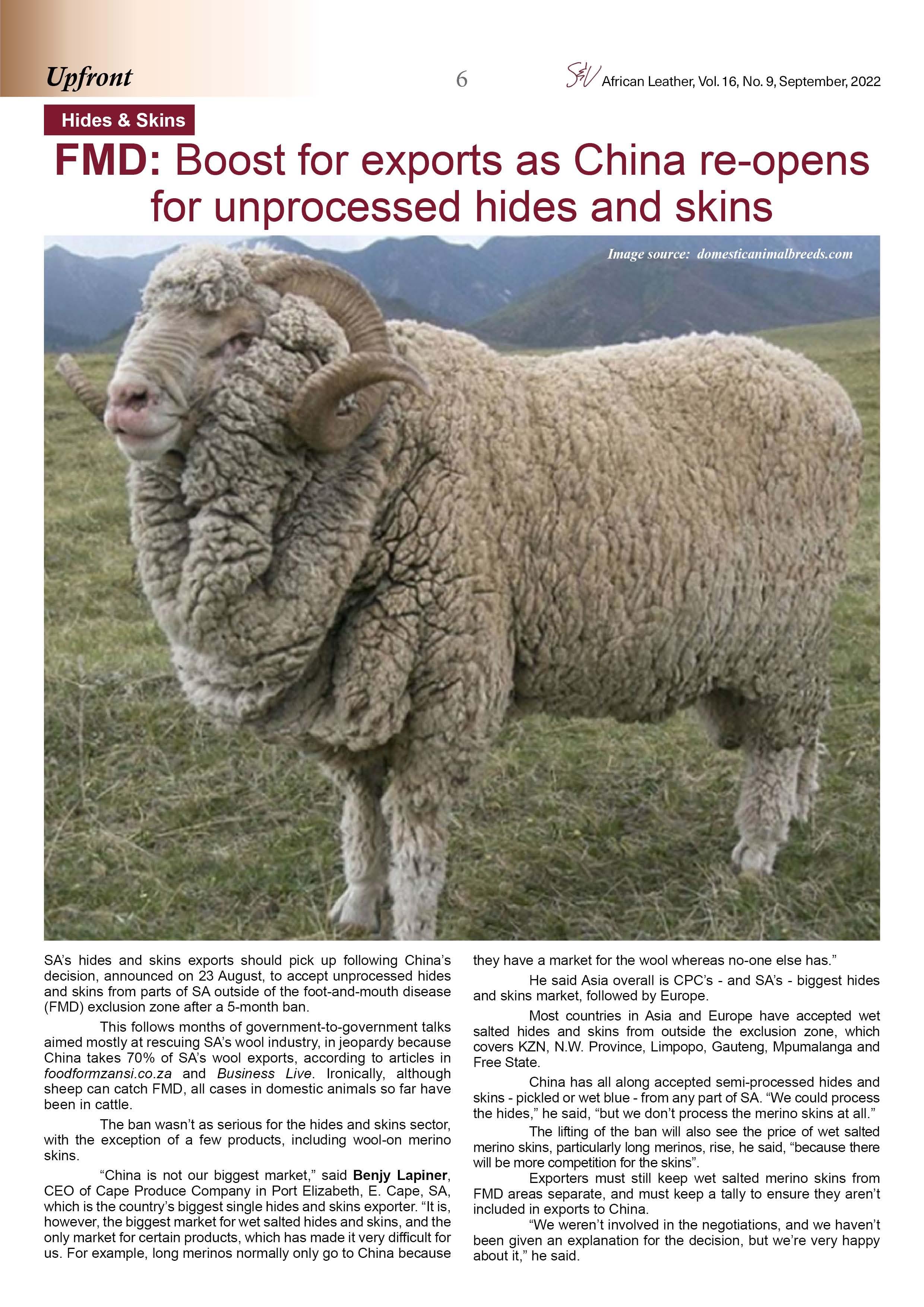 Hides and skins: Boost for exports as China re-opens for unprocessed hides and skins despite FMD in SA.