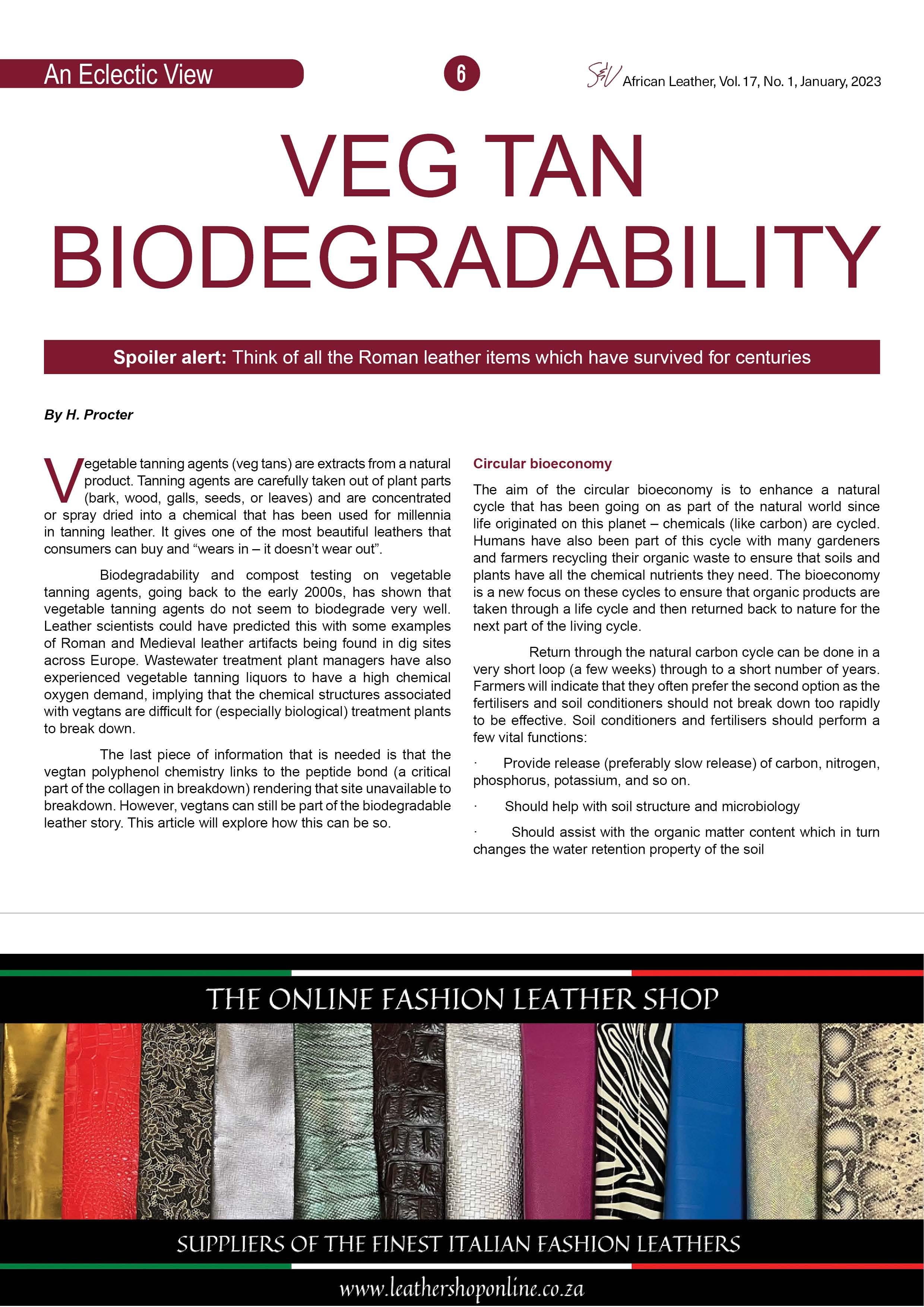 - Veg tan biodegradability: Spoiler alert - think of all the Roman leather items which have survived for centuries, writes H. Procter.