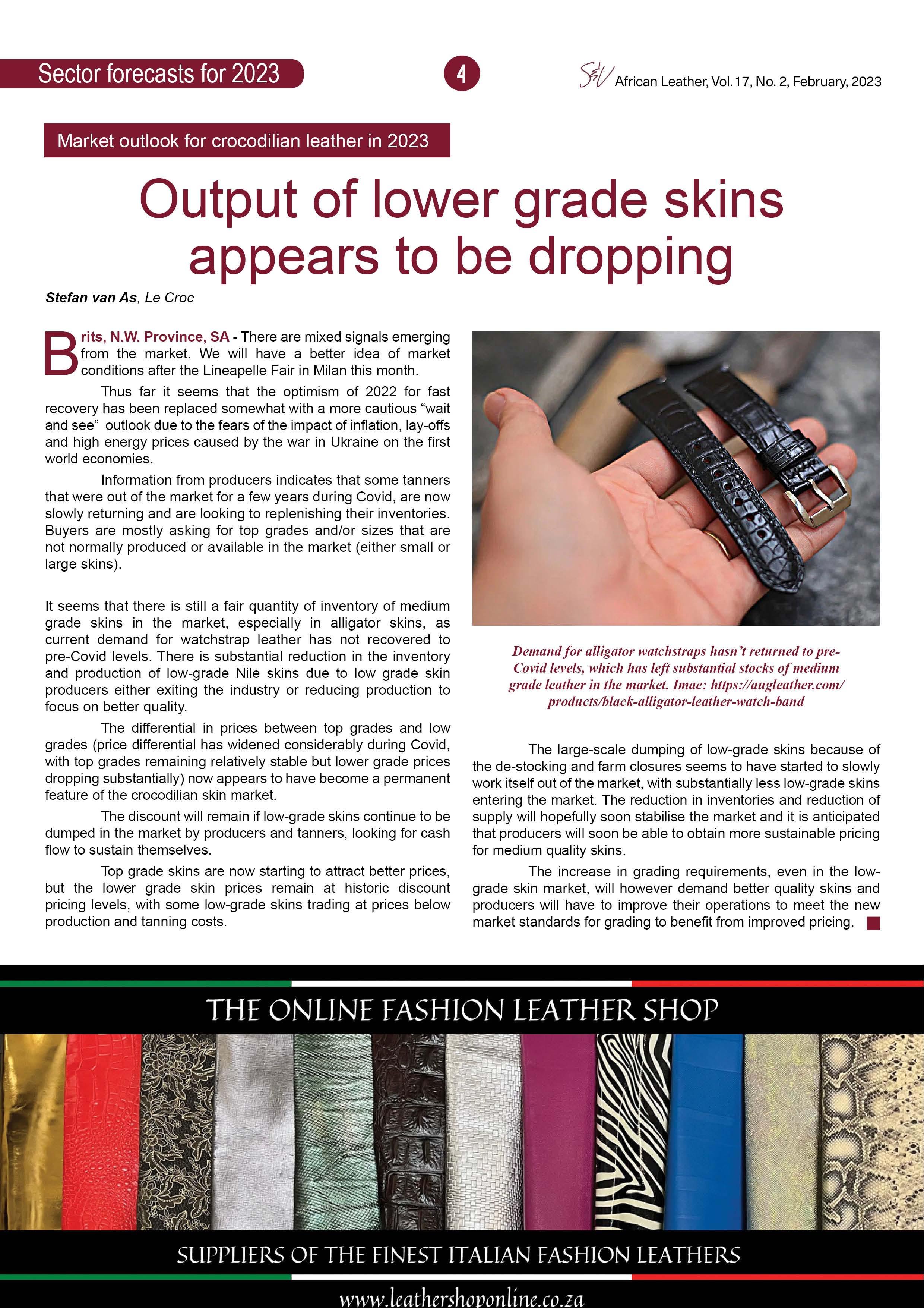 Market outlook for crocodilian leather: Output of lower grade skins appears to be dropping, says Le Croc's Stefan van As.