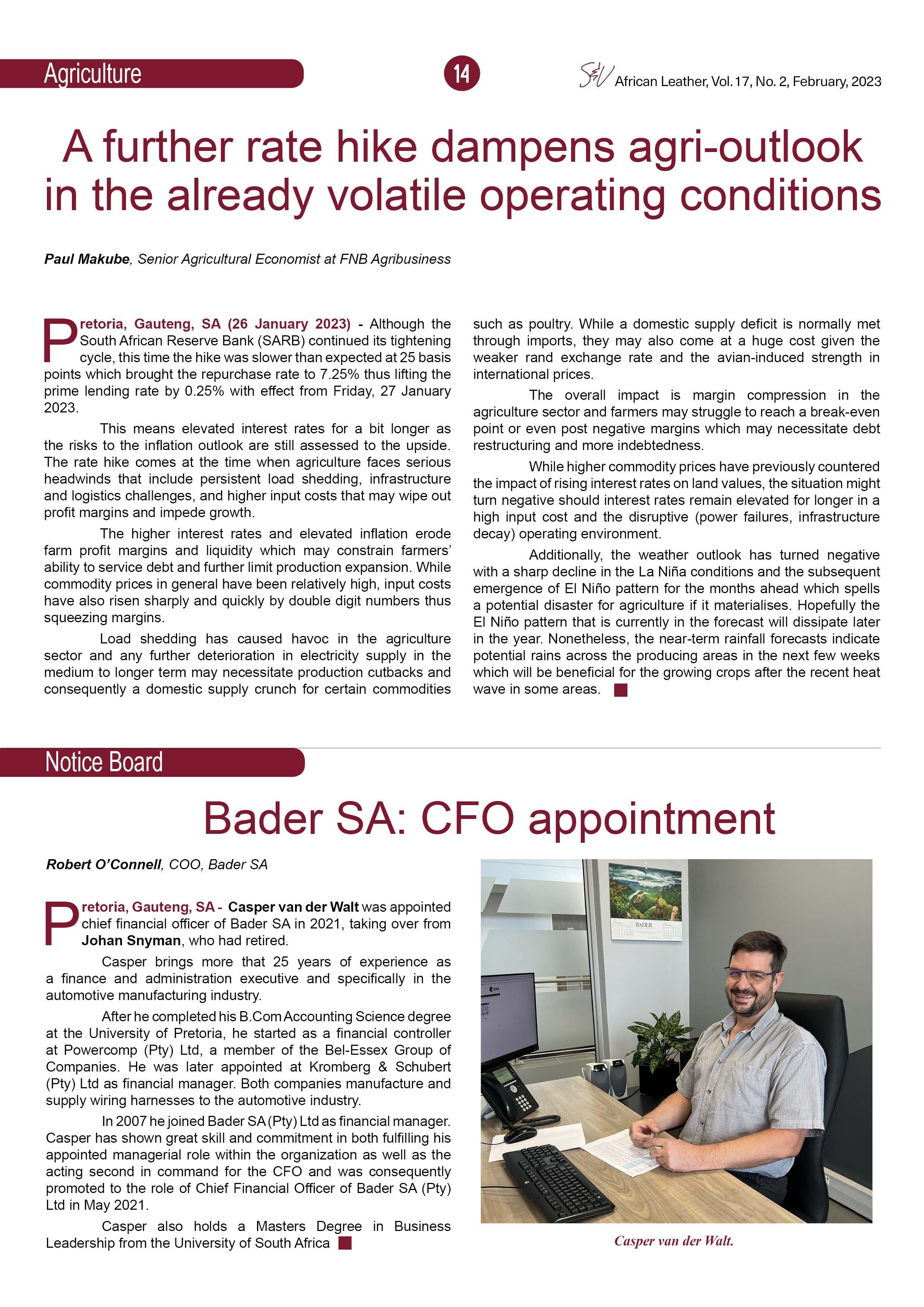 Bader SA: Appointment of CFO Casper van der Walt.
