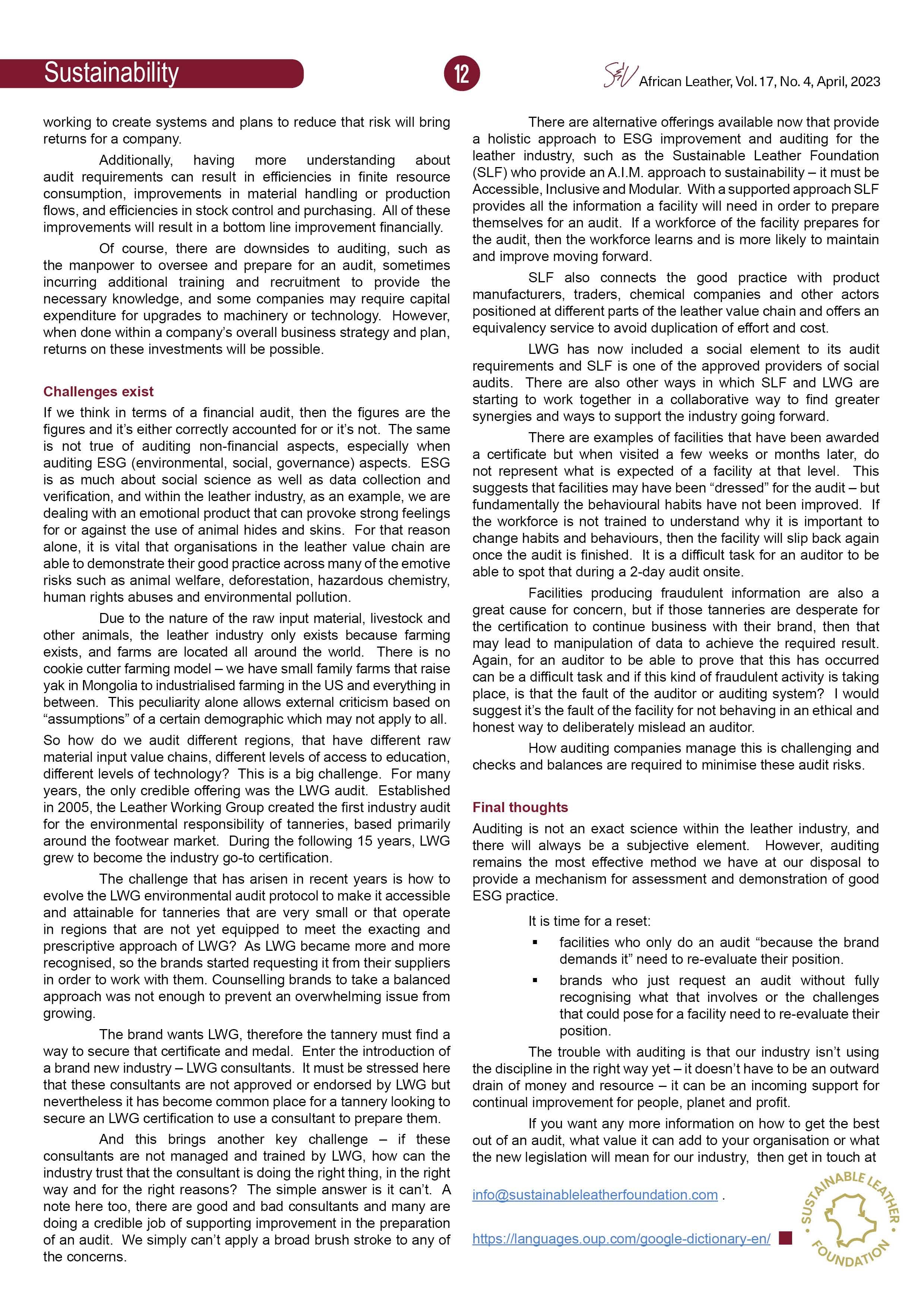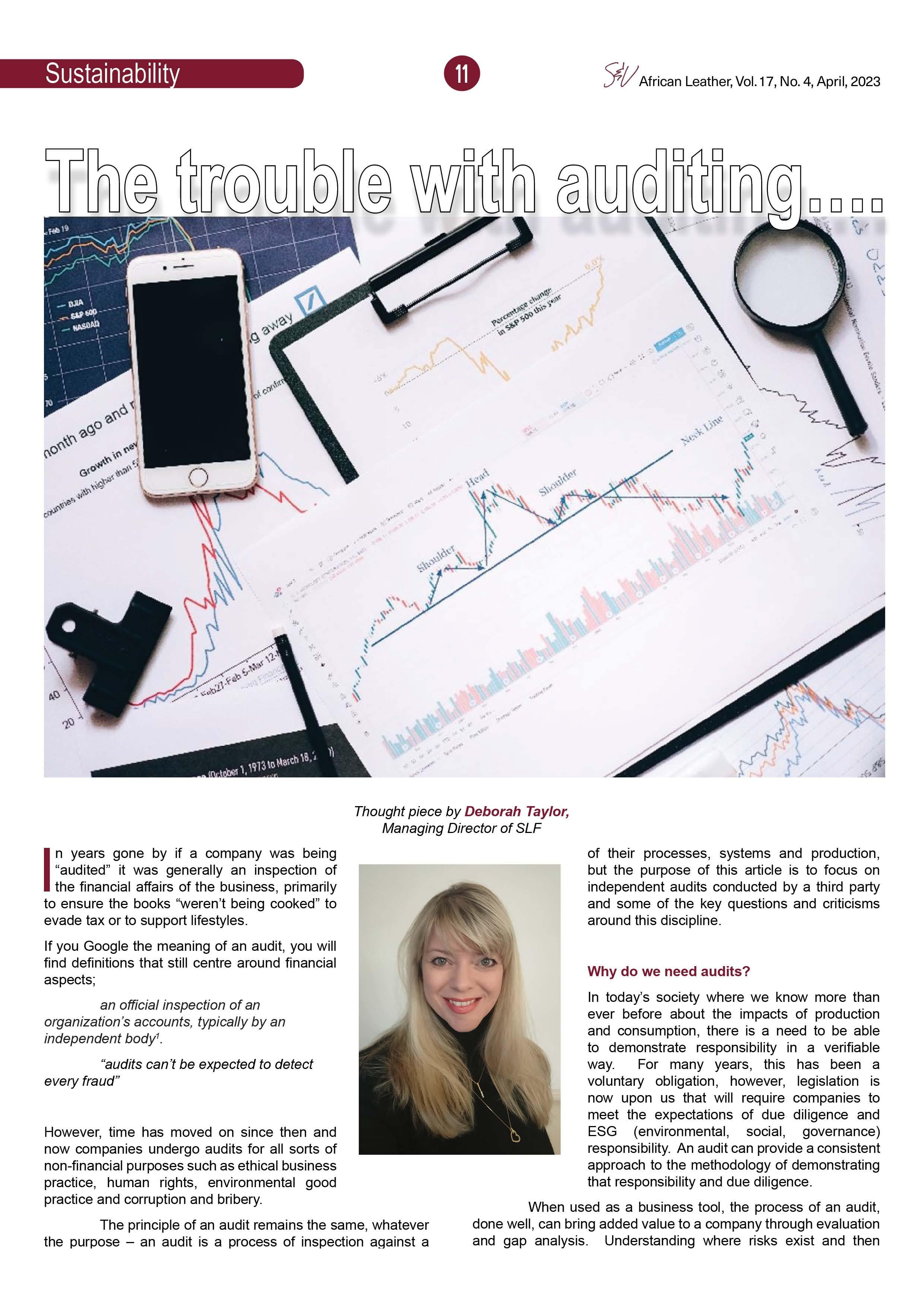 The trouble with auditing...is that when it comes to auditing a tannery, there is no simple process, writes Sustainable Leather Foundation MD Deborah Taylor.