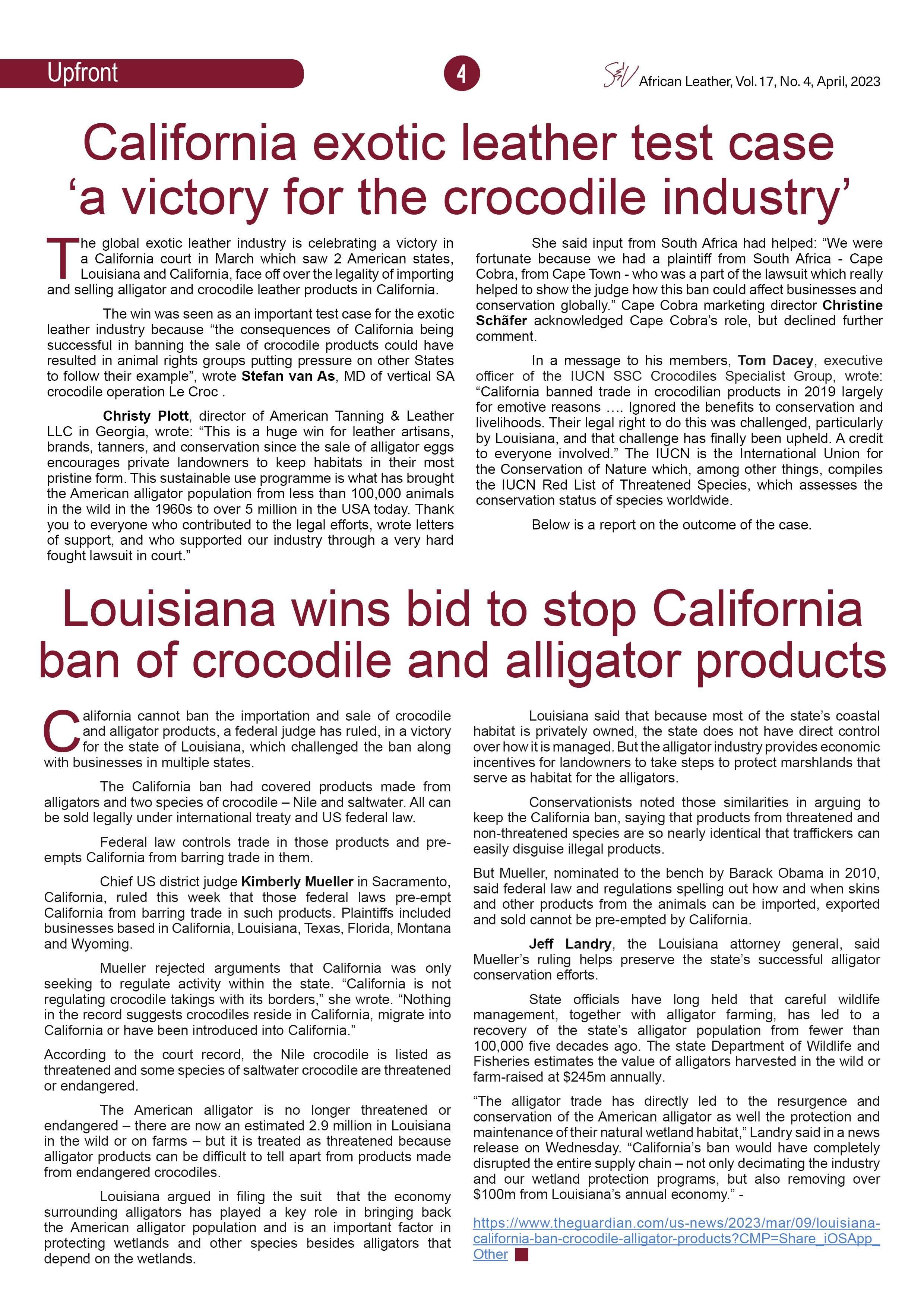 Louisiana wins bid to stop California ban of crocodile and alligator products.