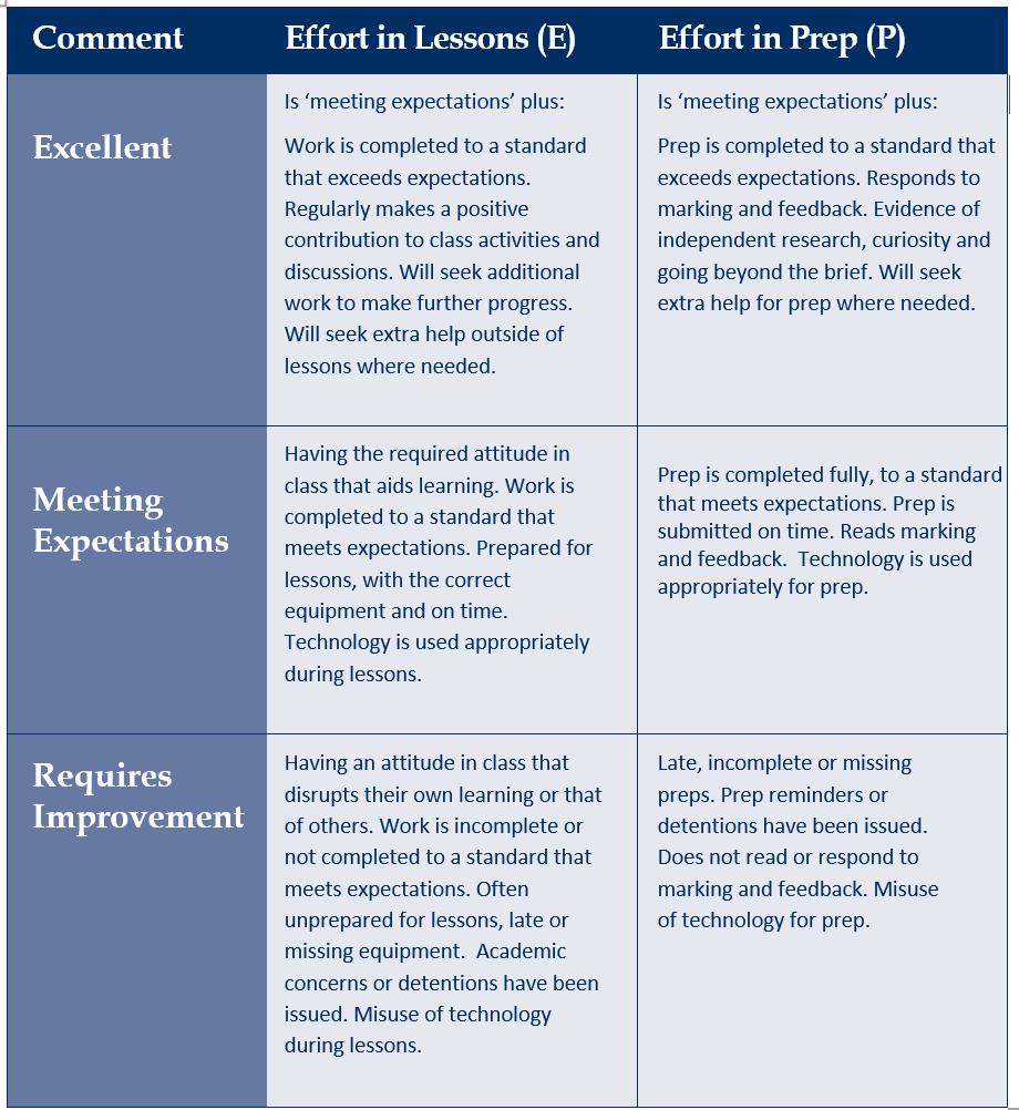 Effort in both the classroom and in prep is graded using the following criteria: