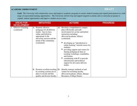 A. Promote effective A2. Develop a comprehensive campus pedagogy for all delivery plan with faculty and staff modes: face-to-face, involvement for on-line and hybrid online and hybrid as instruction including: appropriate to the (Provost/Academic Affairs) university mission and the (continued) needs of the community. ► developing an “introduction to (continued) online learning” tutorial course for students; ► providing support and venues for sharing pedagogical ideas at teaching workshops, roundtables, and forums; ► coordinating with IT to provide infrastructure and technical support for all course delivery modes. B. Promote excellent teaching B1. Identify strategic methods of and by assuring systems are in venues for recruiting faculty. place to recruit and hire (Provost/Academic Affairs, Human quality and diverse faculty. Resources, College Deans)