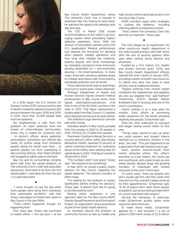 Bay County Health Department, where The University Clinic now is housed in downtown Bay City. During his time there, he watched the opioid crisis develop both afar and near. The CDC in March 2016 issued recommendations to the nation’s doctors, urging caution when prescribing highlyaddictive painkillers. Since 1999, the amount of prescription opioids sold in the U.S. quadrupled. Medical professionals had lowered the threshold for deciding when patients needed painkillers and how long they needed the medicine, experts argued, and those increasingly lax standards resulted in more Americans growing dependent on — and eventually abusing — the pharmaceuticals. In many cases, those pills served as gateway drugs to cheaper alternatives with more potency and deadly potential such as heroin. Those national trends took an alarmingly local turn in recent years, Strasz observed. Michigan Department of Health and Human Services figures showed medical professionals in Bay County wrote more opioid prescriptions-per-person (1.9) than in any of the 82 other counties in the state in 2015. That figure represented a sizable spike from Bay County’s 1.2 opioids prescribed-per-person just six years earlier. The statistical surge seemed to coincide with other trends. Overdose deaths in Bay County jumped from five people in 2005 to 25 people in 2016. Of those 25, 23 died from opioids. Riverhaven Substance Abuse Services, a recently-defunct office within Bay-Arenac Behavioral Health, reported 15 percent of clients receiving treatment for substance abuse at the facility were seeking help for opioid abuse in 2005. That figure soared to 48 percent in 2014. “The numbers didn’t look good,” Strasz said. “We needed to do something.” In May 2015, he issued a public health advisory for Bay County regarding the opioid epidemic. The advisory remains in effect today. “I’m waiting for the problem to lessen significantly before ending the advisory,” Strasz said. “It doesn’t look like it’s going to do that anytime soon.” Raising public awareness is one approach taken by The Bay County HOPE (Heroin Opioid Prevention and Elimination) Project, an organization Strasz assembled as part of the public health advisory. Its members discuss the problem at community forums as well as middle and