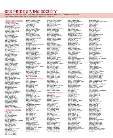 THE RED PRIDE GIVING SOCIETY EXCLUSIVELY RECOGNIZES ALUMNI WHO MADE GIFTS TO THE UNIVERSITY Recognizing those who made a gift to svsu SVSU between january 1 and december 31, 2011 IN 2013. THEIR NAMES ARE RECORDED HERE AS WELL AS IN THE ANNUAL GIFT CLUBS LIST.