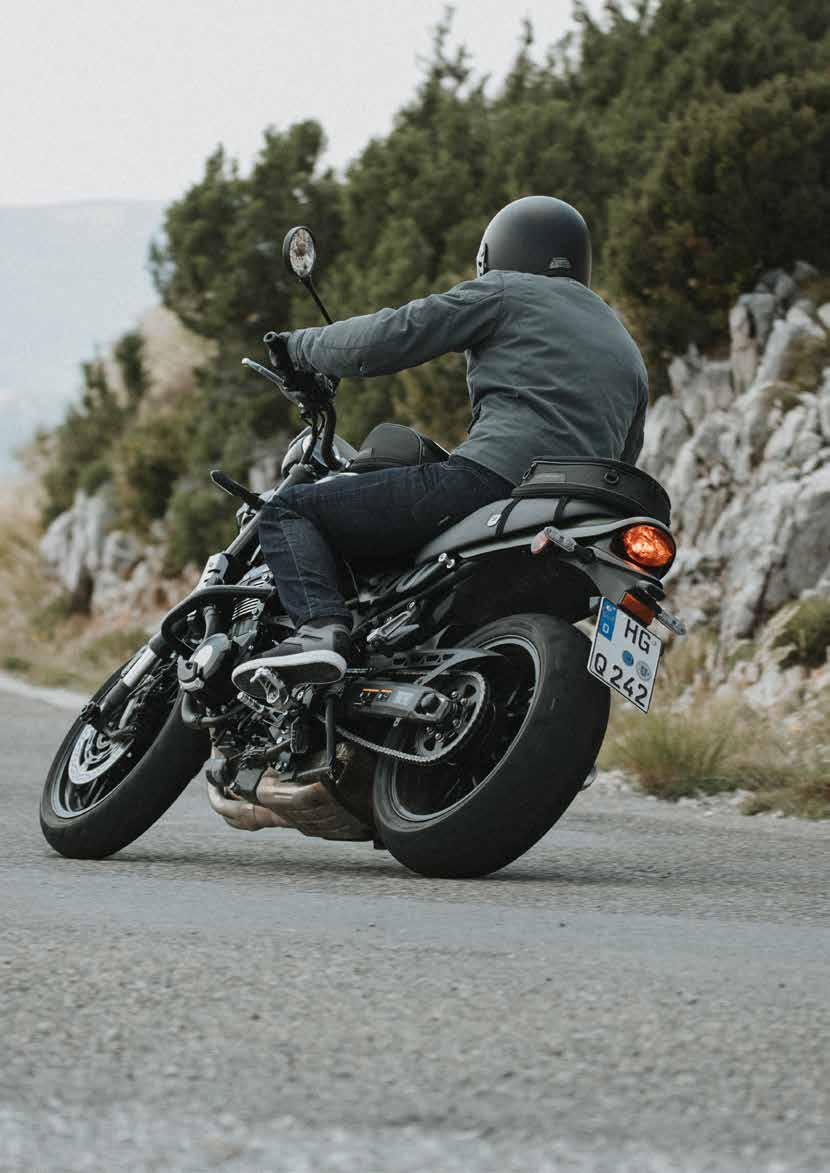 En cuanto volvemos al asfalto, cambio al modo Sport y disfruto de la potencia del potente motor V2. A pesar de la rueda delantera de 21 pulgadas, la DesertX tiene una respuesta sorprendentemente buena en la carretera: incluso en las curvas más cerradas siempre se siente bien. Ducati ha conseguido aquí construir una moto sensible y fácil de conducir que se siente cómoda en cualquier pista. Y también me atrae visualmente; con su delgado colín y su característico faro doble, tiene un aspecto distintivo que destaca entre la multitud. Independientemente del tiempo de calidad en el DesertX, es muy divertido utilizar nuestros productos yo mismo y ponerlos en el punto de mira para fotos y vídeos. No se sabe si volveré a participar como modelo. Pero nuestra nueva Ducati y los accesorios SW‑MOTECH son ideales para este tipo de encargos, y el viaje al campo nos proporcionará mucho material de alta calidad en nuestras tarjetas de memoria.