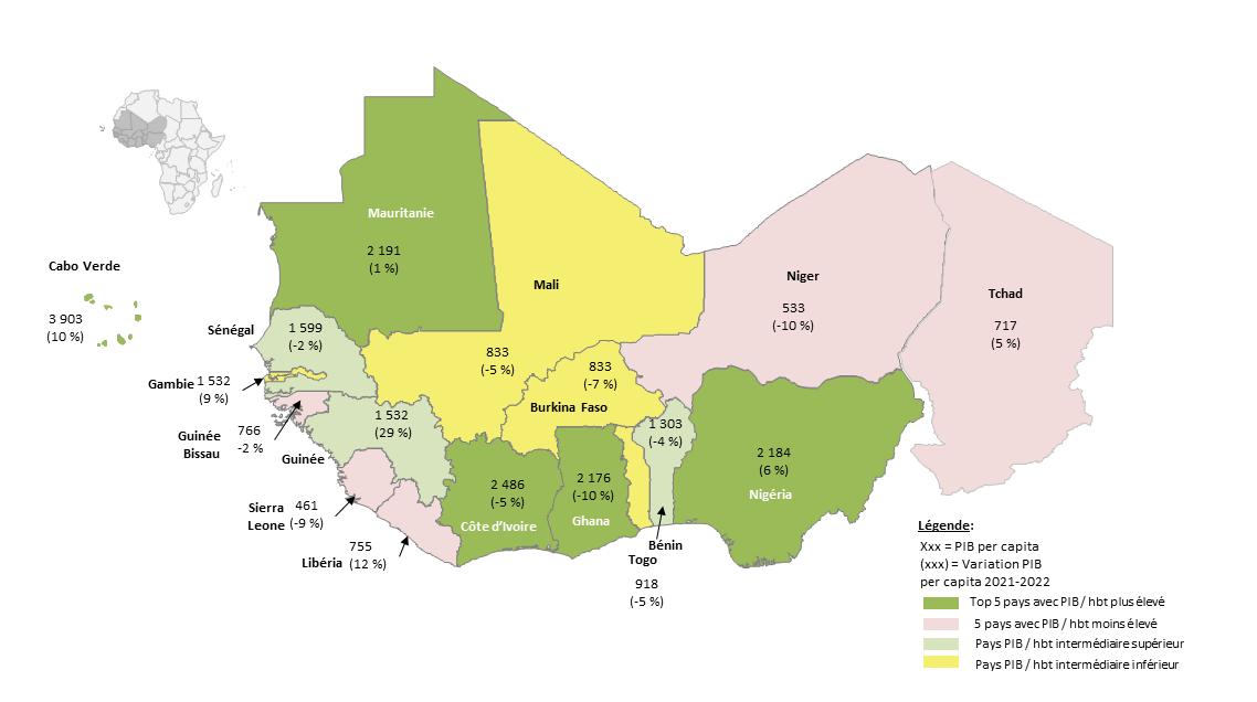 Selon les données de la Banque Mondiale, le Cabo Verde, la Côte d’Ivoire, le Ghana et le Nigeria sont les pays les plus riches dans la région avec un PIB par habitant entre 2 176 et 3 903 USD per capita. Parmi les pays qui ont moins de ressources par habitant, on retrouve le Niger, le Tchad, le Liberia, la Sierra Leone et la Guinée Bissau. Sur les 17 pays, 9 ont enregistré une baisse du PIB par habitant.