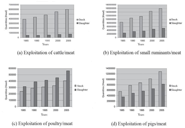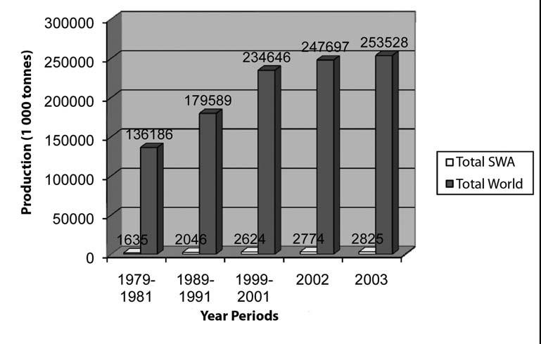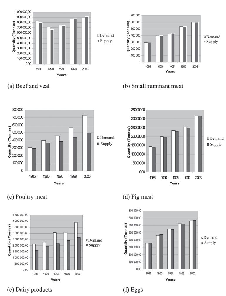 Regarding unexploited potential, the strategic view of the livestock sector in the SWA region must encompass the short term as well as the medium and long terms (Chapter 7). In the short term, strategic orientations must be based on the two main strategic animal products – meat and dairy products – in order to meet a demand of 3.5 million t for meat products (from cattle, small ruminants, poultry and pigs) and 4.5 million t for dairy products by 2015. A second short-term orientation will have to be the boosting of the contribution of the livestock sector to reducing poverty and food insecurity in the various countries. In the long term, the SWA countries must equip themselves with the necessary means of entering the world market in animal products by working towards compliance with health and phytosanitary standards for these products, thus establishing the conditions for fair competition among producers while protecting consumers from improper and dangerous practices.