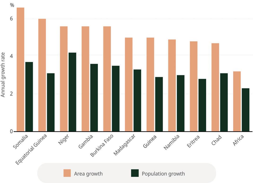 The growth in urban area expansion is projected to exceed the growth in urban population, 3.2% compared to 2.3% per year. Urban population growth does not translate directly into urban area growth due to a variety of political, environmental, and historical factors. Politically, zoning laws and urban planning policies can restrict the physical expansion of cities. Environmental constraints, such as the availability of water, arable land, and the presence of natural barriers like mountains or bodies of water, can limit the sprawl of urban areas. These intertwined factors create a complex dynamic and highlight the diversity of national contexts in Africa.