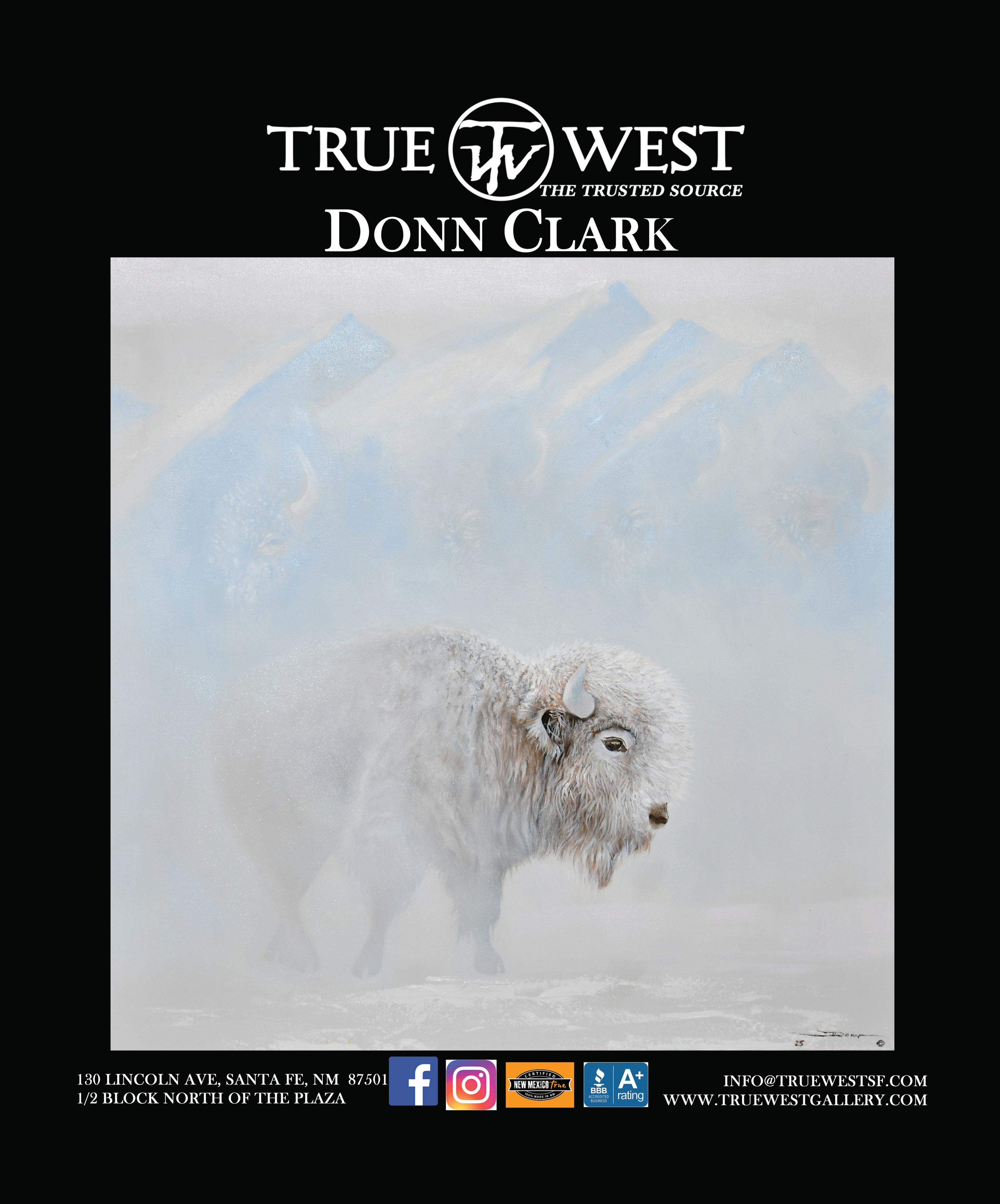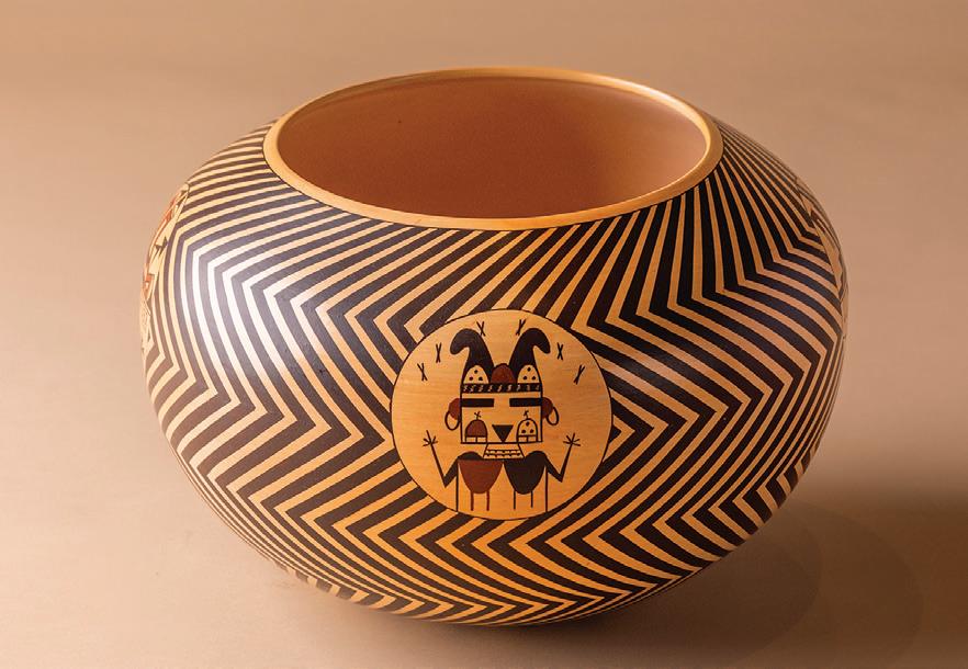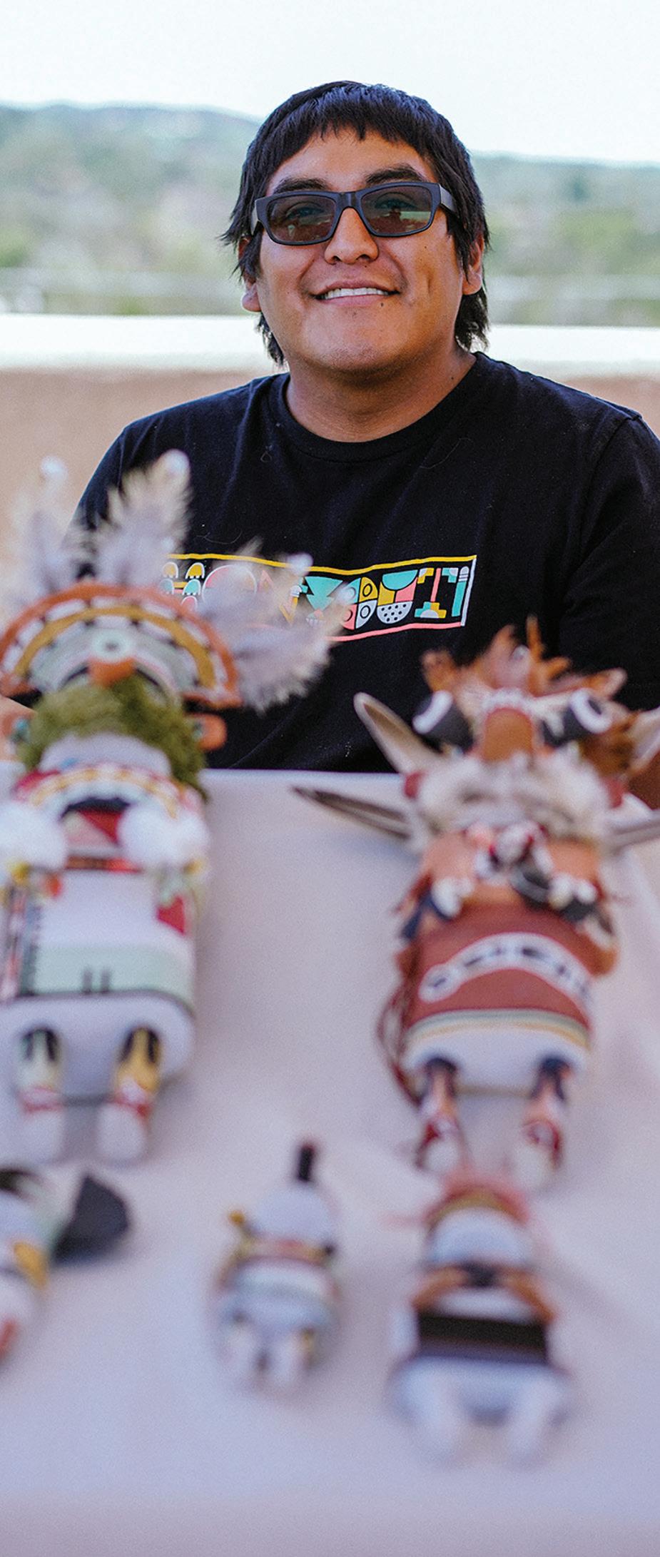 This oil painting on linen by Choctaw artist Karen Clarkson was a natural fit to represent both traditional Native values and modern innovations as our cover image. It’s a Good Day to Dance! vibrates with the joy of a Diné child dancing in traditional regalia “with all her heart while her mom looks on,” Clarkson says. The image speaks of both hope for the future and respect for the past, perfectly representing SWAIA’s slogan for this year — Iconic Beginnings: Legacies in Motion. The award-winning Clarkson says her art has always been “about selfdiscovery and developing a way of communicating to others.” Find her in booth LIN E 726 at the Santa Fe Indian Market and online at clarksonart.com.