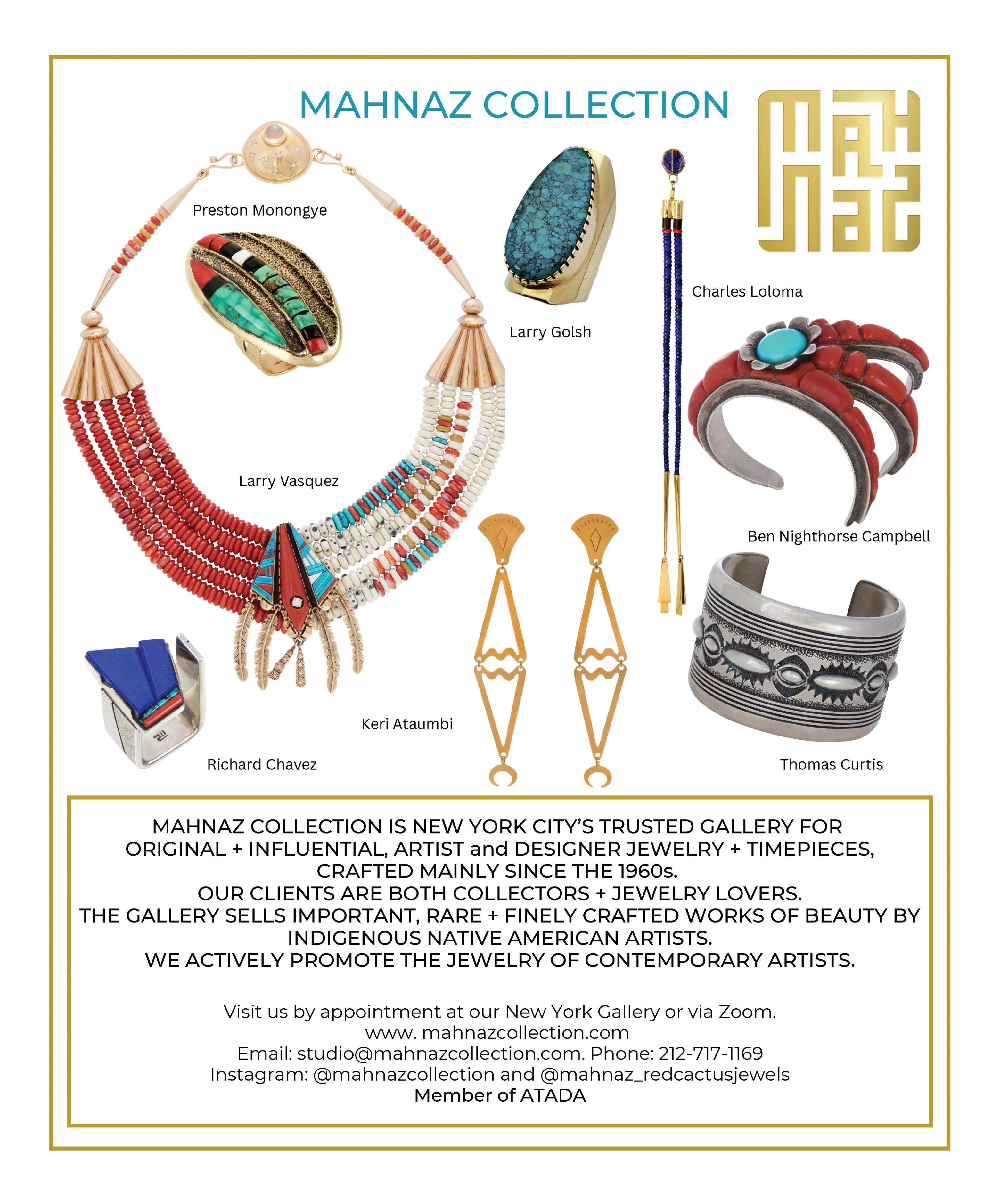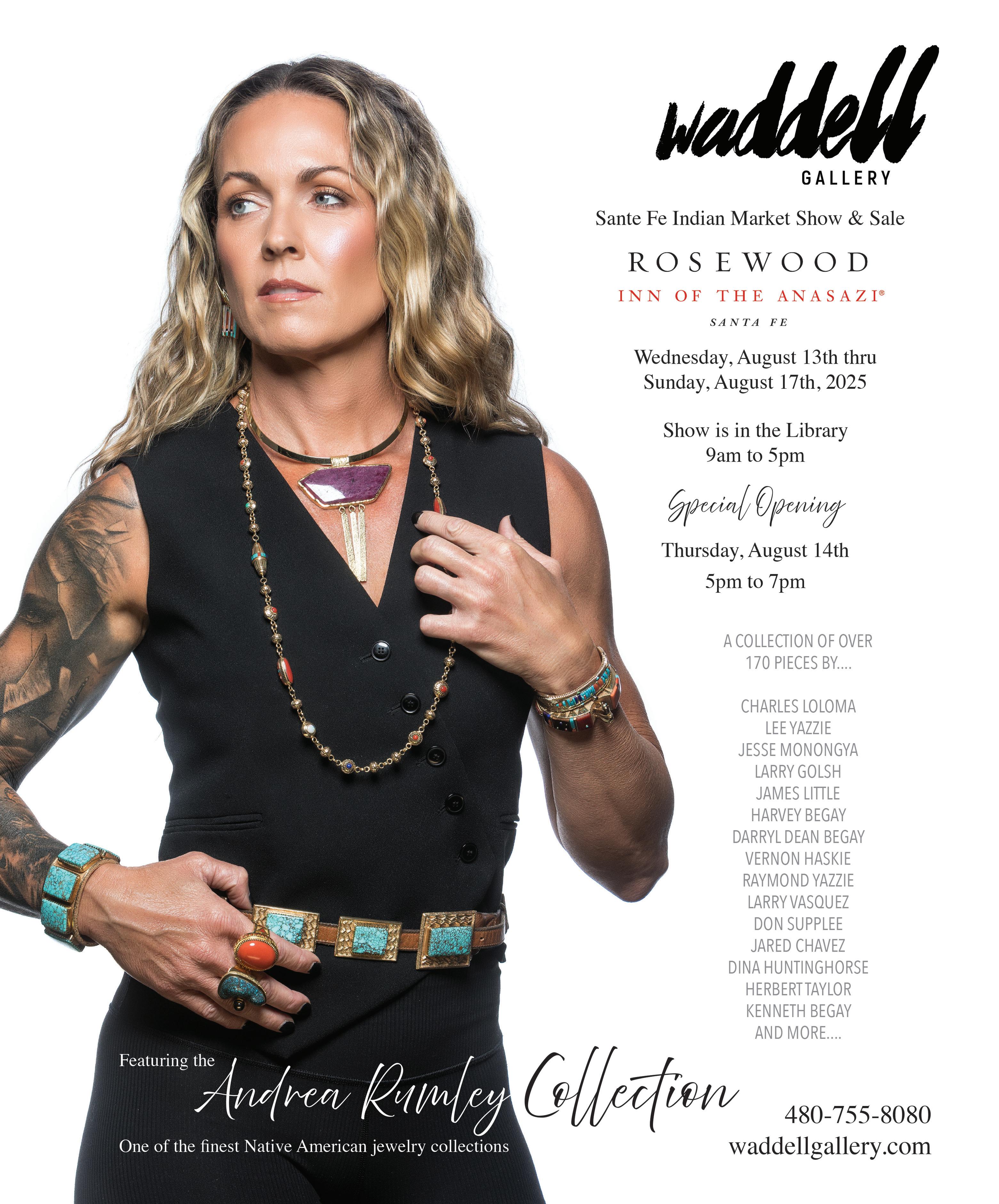 Waddell Gallery is offering the late Andrea Rumley’s major collection of Native American jewelry. There are more than 170 pieces in the collection by artists Charles Loloma, Lee Yazzie, Jesse Monongya, Larry Golsh, James Little, Harvey Begay, Darryl Dean Begay, Vernon Haskie, Raymond Yazzie, Larry Vasquez, Don Supplee, Jared Chavez, Dina Huntinghorse, Herbert Taylor, Kenneth Begay, and more. The gallery says, “This is the best inventory of Native American jewelry we have ever featured at any of our shows.”