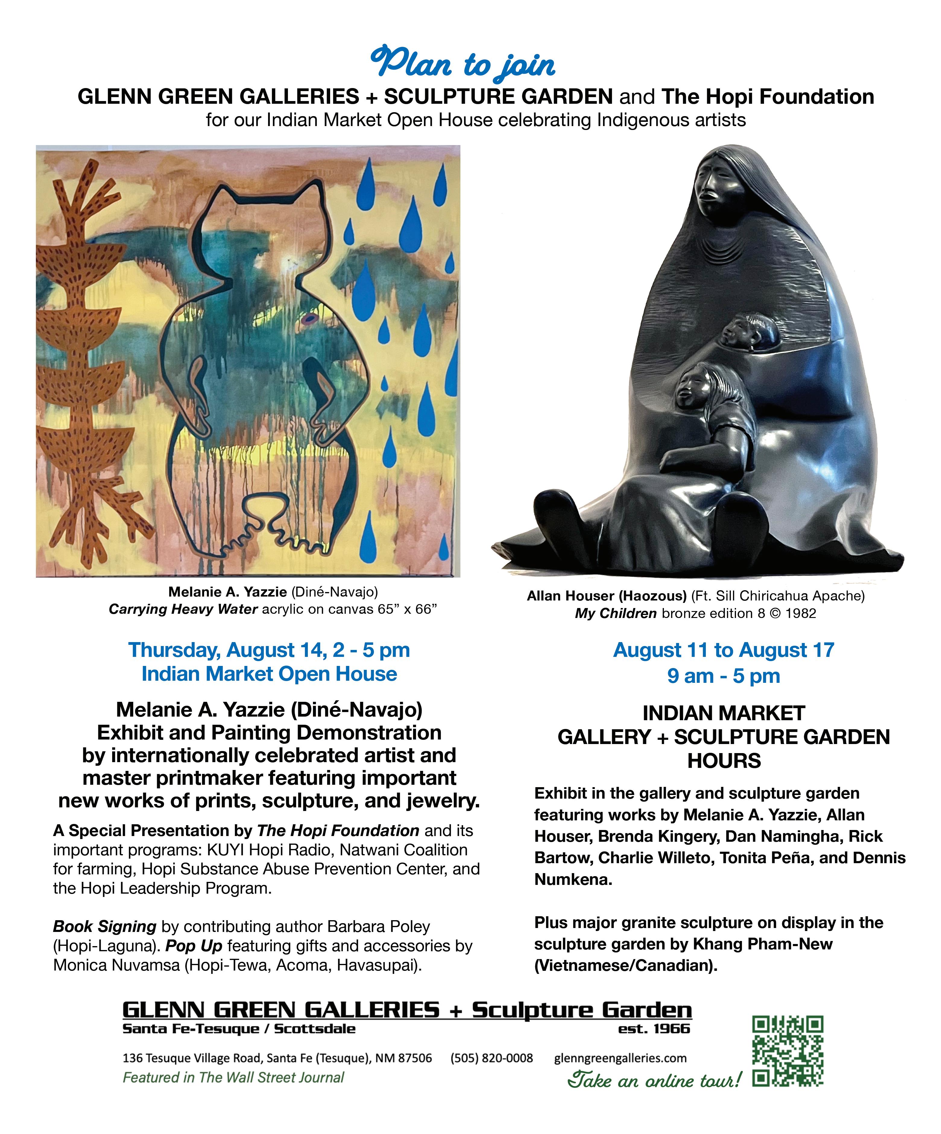 Glenn Green Galleries Indian Market Open House features new, large-scale paintings and a demonstration by internationally celebrated master printmaker and artist Melanie A. Yazzie (Diné). Yazzie’s recent works on paper and sculpture will be available for purchase.