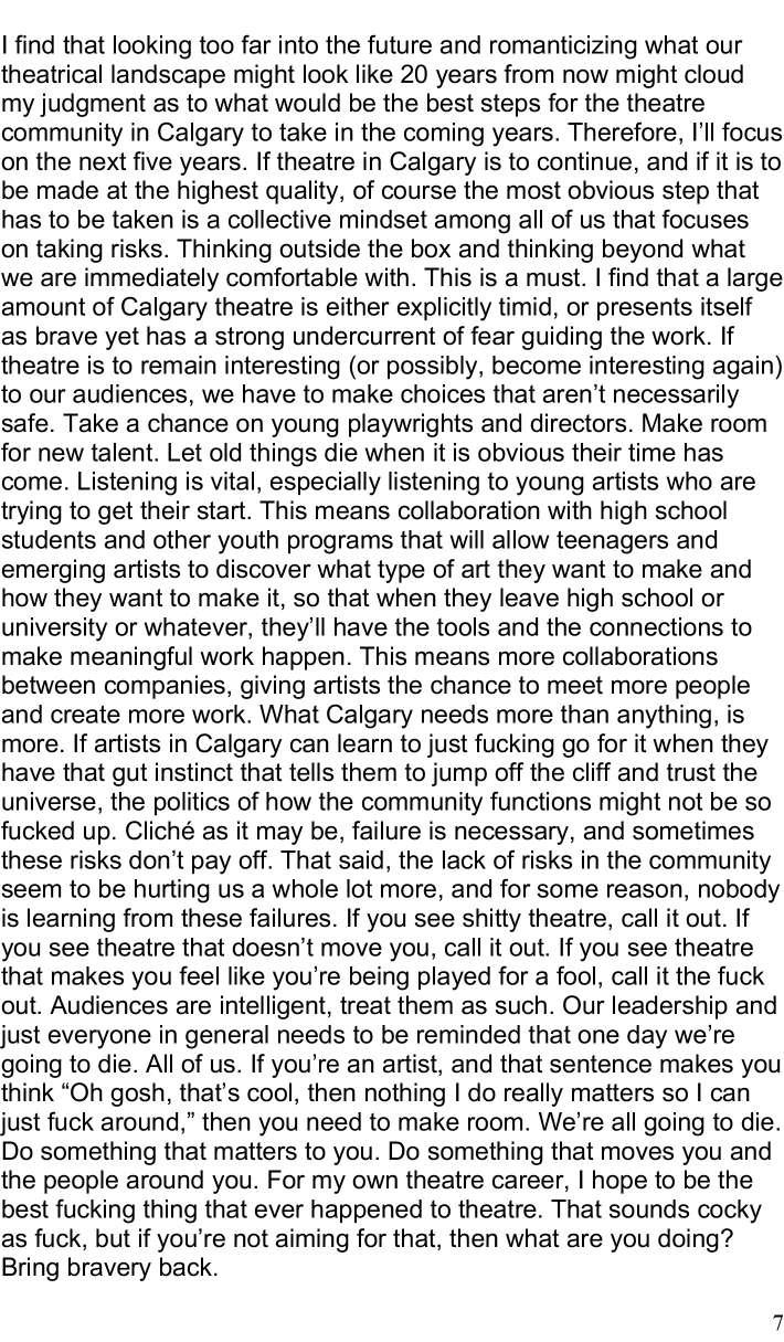 • What is one thing that you wish the current leadership of Calgary’s theatre companies knew, understood and acted upon?