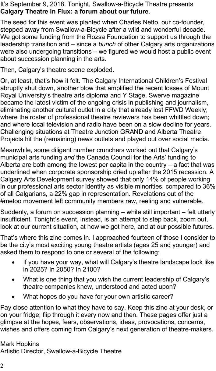 On September 9, 2018, Swallow-a-Bicycle Theatre presented Calgary Theatre in Flux: a forum about our future.
