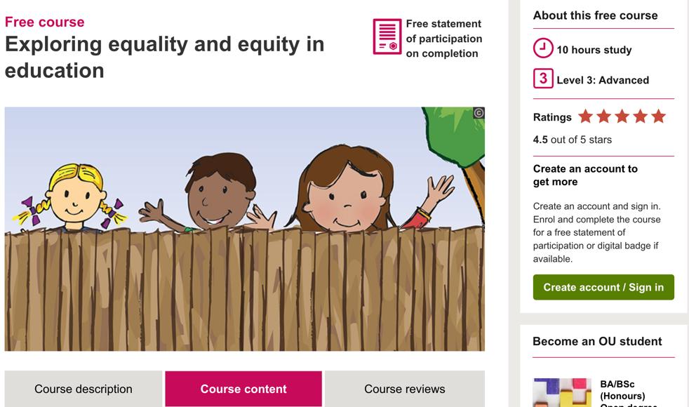 • You may like to look at other Open University free course, such as Exploring Equality and Equity in Education https://www.open.edu/openlearn/education-development/exploringequality-and-equity-education/content-section-0?active-tab=content-tab