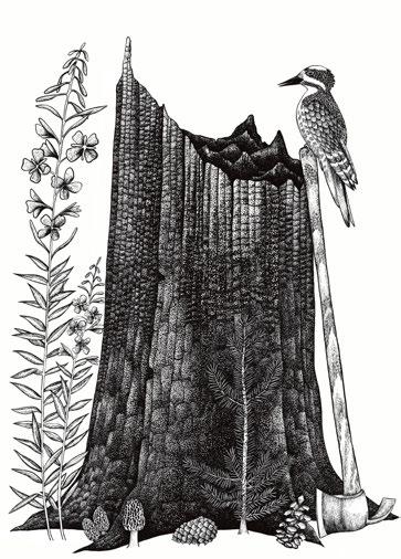 medicines. We collected morels where the Crazy Horse Fire had burned and grew to recognize the birds that made their homes in charcoal-stained snags. The land relied on fire for renewal as much as we relied on fire for warmth and food and medicines, and at some point, it clicked. If the landscapes that shape us are themselves shaped by fire, then fire is part of what shapes us. I didn’t go on to study fire or to become a wildland firefighter like so many family members and friends, but fire remained a constant in my life as summer skies grew thicker with smoke, and wildfires continued to burn hotter and more frequently across the globe. When I started a career in conservation, fire showed up as a central theme in almost every conversation on the intricate and complex relationships between people and place. As an artist and someone who grew up in a storytelling culture, I began to see fire as both a main character and an ever-present backdrop in the story of the West and other fire-dependent landscapes. So, when I was asked to create cover artwork for a podcast on wildfire and later invited to illustrate a book inspired by that podcast, the answer was easy. I worked with the authors and editors to draft concept sketches as fresh snow blanketed the hills around Missoula, and submitted final illustrations when Rattlesnake Creek began to swell with spring runoff. Throughout the summer, we waited - waited for publication day and waited to see what the everexpanding fire season would bring. As devastating wildfires broke out in Hawaii, Greece, California, and across the globe, and checking air quality indexes became part of the morning routine once more, the impacts of climate-driven wildfires and the critical need to reassess how we live in landscapes that depend on fire were felt more deeply than ever. While there is no single solution to the complex challenges we face, I believe that this book can serve as a valuable resource in our collective efforts to better understand and live with wildfire today.