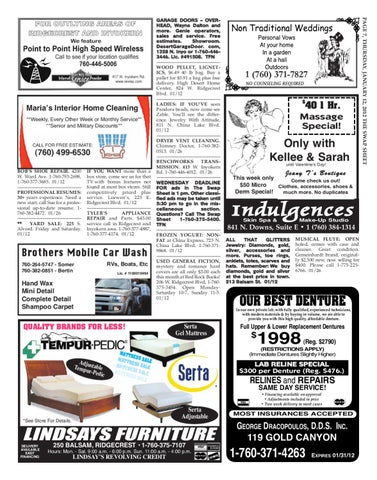 BENCHWORKS TRANSMISSION. 413 W. Inyokern Rd. 1-760-446-4012. 01/26 WEDNESDAY DEADLINE FOR ads in The Swap Sheet is 1 pm. Other classified ads may be taken until 5:30 pm to go in the miscellaneous section. Questions? Call The Swap Sheet 1-760-375-5400. TFN FROZEN YOGURT: NONFAT at China Express. 723 N. China Lake Blvd. 1-760-3719868. 01/12 USED GENERAL FICTION, mystery and romance hard covers are all only $3.00 each this month at Red Rock Books! 206 W. Ridgecrest Blvd, 1-760375-3454. Open MondaySaturday 10-7, Sunday 11-5. 01/12