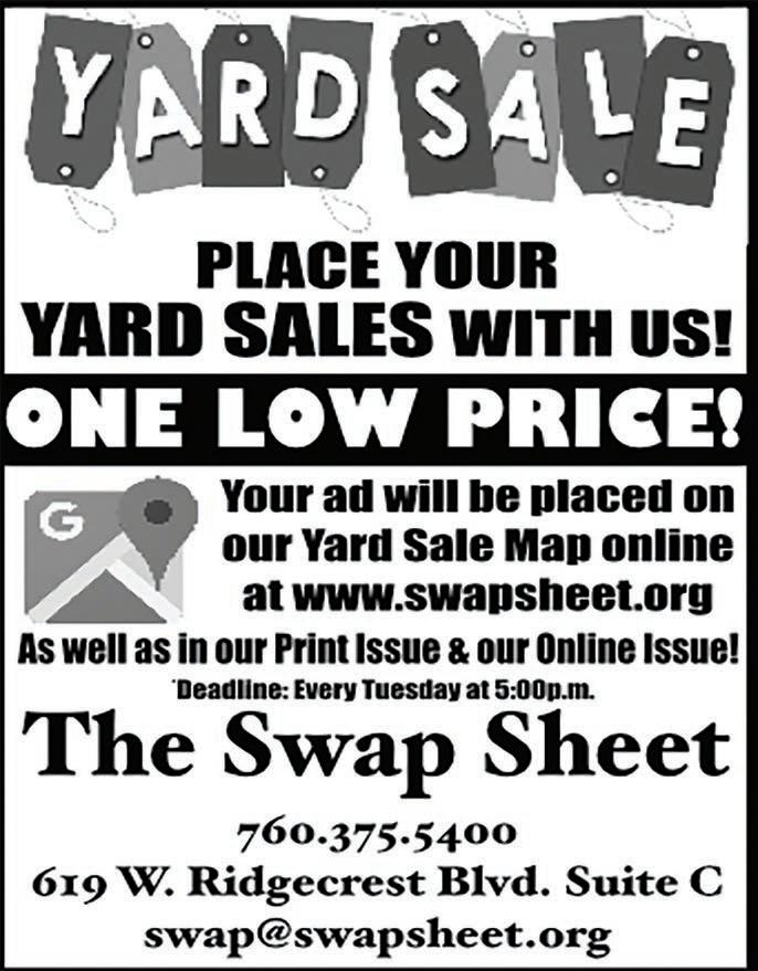 BOOKS February sale is 25% off all Romance! That includes new, used and even some special orders! 206 W Ridgecrest Blvd, Mon-Sat 10-6, Sun 11-5. 760-375-3454 02/05