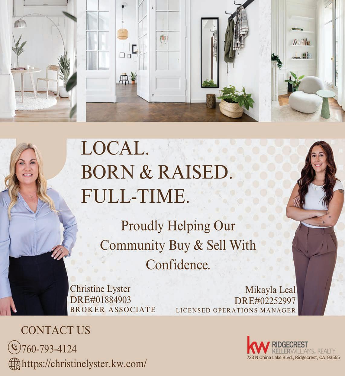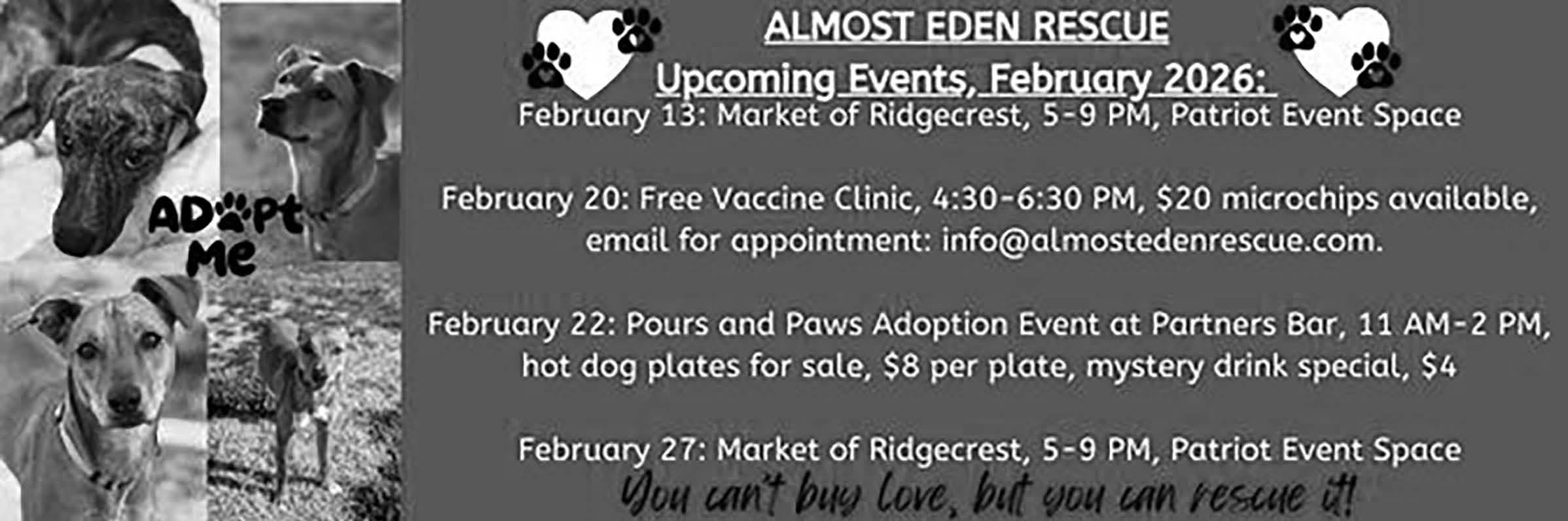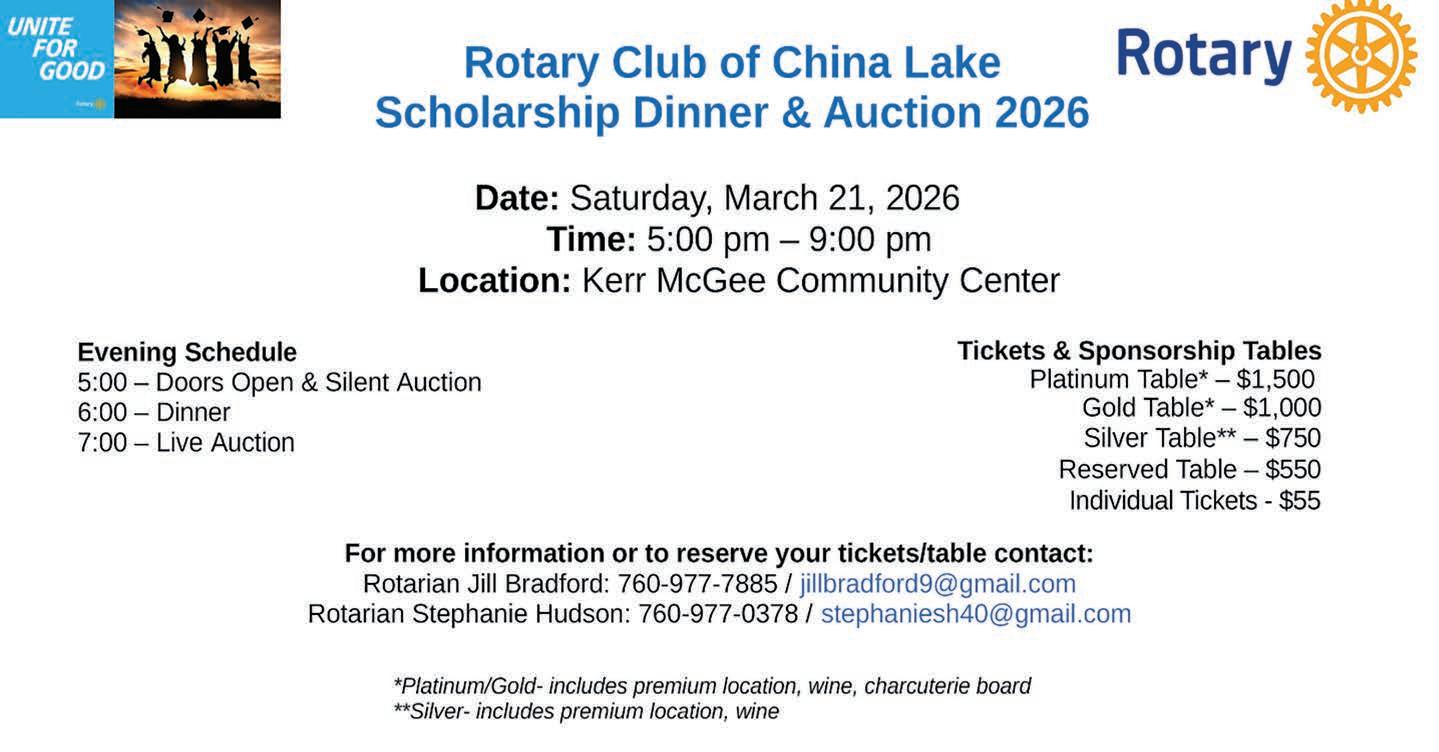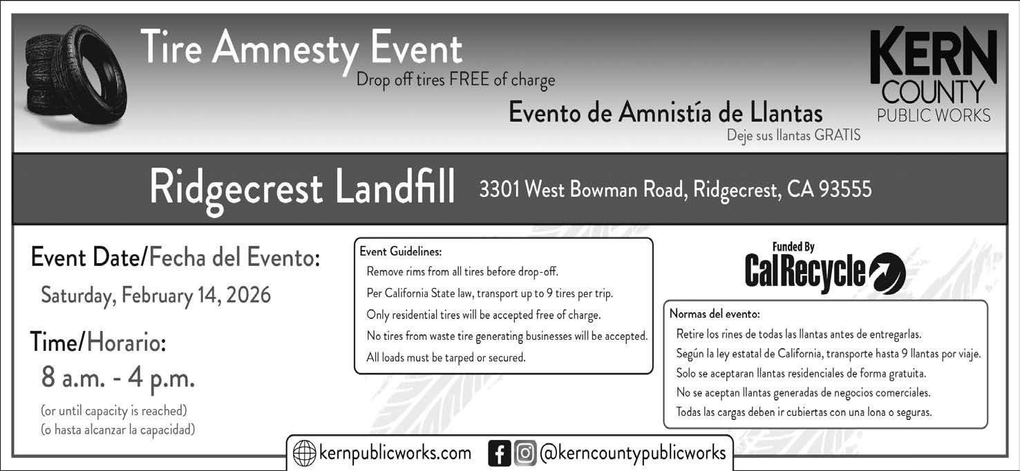 Our company is interested in presenting opportunities to serve in the Indian Wells Valley! Be it for a community organization, government, hospital, school, service club or wherever, we will help make them known to you. Here is another opportunity... 2 Gill Station Road, Coso Junction Little Lake, CA 93542. • 760-764-1300