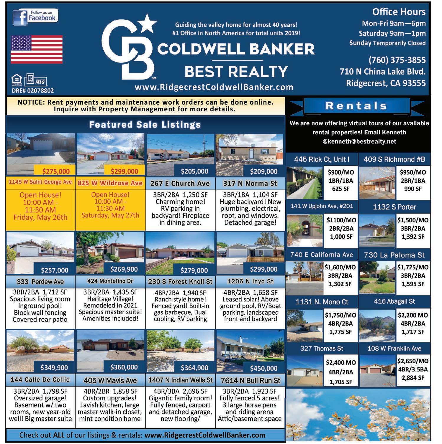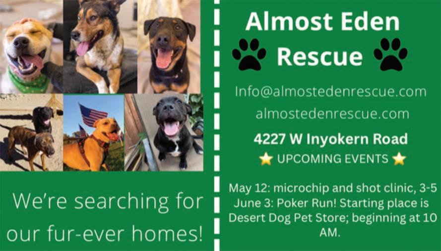 STAFFORD’S Pest Control OUR EXTRAS NEW SERVICE START UP SPECIAL CALL US! ...that is what makes our services extraordinary! Inside and Outside Service Monthly or Bimonthly 721 N. China Lake Blvd. • 760-375-7575 staffordpest@gmail.com Se Habla Español • Disinfection Service • Bed Bug Heat Treatment • Bio-Remediation Drain Service • Weed Abatement • Rodent Exclusion • Bird Exclusion • Gopher Trapping • Snake Repellant • Rabbit Repellant • Tree Treatments Borers/Termites • Drought Treatment (Great for Lawns) • Termite Inspections and Solutions MON REVE French Country Cuisine Dine in following CDC precautions! Delivery or to go available! AIR CONDITIONING, Inc. Lic. # 680890 1610 N. Inyo St. Ridgecrest, CA 93555 Heating • Sheet Metal Senior Discount Phone: (760) 446-6000 Fax: (760) 446-0907 Serving the Valley Over 40 Years! • Service & Installation • Day & Night • Cooler Start Up / Shut Down • Mini Splits • Aerocool Trophy & Pro Series • Free bids on installations • Competitive Prices, Quality Work • Emergency Service Available Garages, RV Covers, Carports, Stables, Hay Barns, Etc. 1-760-377-4860 FREE INSTALLATION See Models At 4521 Inyokern Rd. Mon. - Fri. 10am - 5pm
