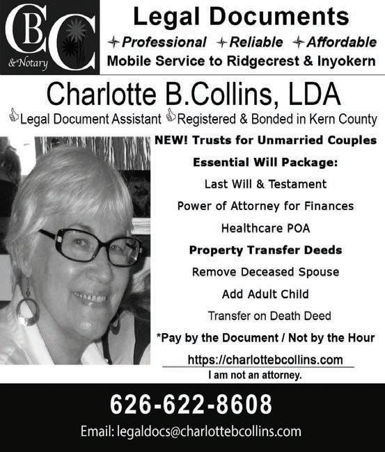 1-760-301-7026. TFN COMMERCIAL KITCHEN REPAIRS. Ovens, stoves, grills, warmers, ice machines, refrigeration. Call Steve 1760-608-7724. 05/25 pAGe 03 THURSDAY, MAY 25, 2023 THe SwAp SHeeT Storage 8x20 - $80 p/mo Storage 8x40 - $125 p/mo Most reasonable rates in town. Reasons why to store at RHB Storage: More space for less money Rates don’t jump around Yearly payment discount available 1-760-375-7727 667 S. Richmond Rd. Unit E., Ridgecrest A&L Tire Service Center and We’re More Than Just A Tire Store... We’re Your Complete Automotive Service Center! • FREE Shuttle Service For Customers Convenience • 24 Hour Roadside Tire Service For Any Vehicle • FREE Vehicle Safety Inspections • Full A/C Service • Napa Care Center • We Offer The Best Nationwide Road Hazard Warranty In Town • Newest State Of The Art Tire Pressure Monitor System Diagnosis With Some Of The Most Affordable Sensors In Town • Only Shop In Town That Has A Wide Variety Of American Made Tires In Stock Hablamos Español 317 West Inyokern Road • www.AandLTire.com (760) 499-MIKE OPEN SATURDAYS! A/C SYSTEM INSPECTION $69 most vehicles LOOK RO S Car Flex Fr e re We W OBERTJWHITING COTT E. WHITING, D ing, Personalized Dent e’r ridays! NG ON GAS DDS DS ental PPO. ces, ITE C istry! GENCIES Open ROOT CANALS • TEETH WHITENI SEDATI • ORAL SURGERY ORAL NITROUS/LAUGHING IMPLANTS • EMER TAAL Y COSMETIC DENTISTR Y CHILDREN’S DENTISTR ROBERT J. WHITING, Delta D All Base Dental Plans and Including Are in Network with Most Insuran We 760-375-6999 . • SUI T. 841 N. DOWNS ST • DENT .whitingfamily Email: wfdridgecrest@yahoo.com • www dental.com 117 E. Ridgecrest Blvd. Ridgecrest, CA 93555 760-463-1297 • Great Food designed for the family! • Priced right • Food specials! Watch the sports games and enjoy the food and drinks! electricity windows/doors roof tile plumbing paint patios/decks additions flooring. framing