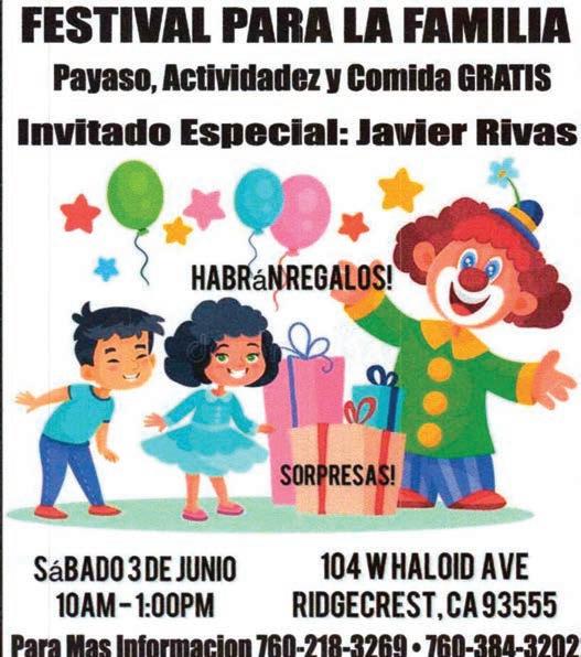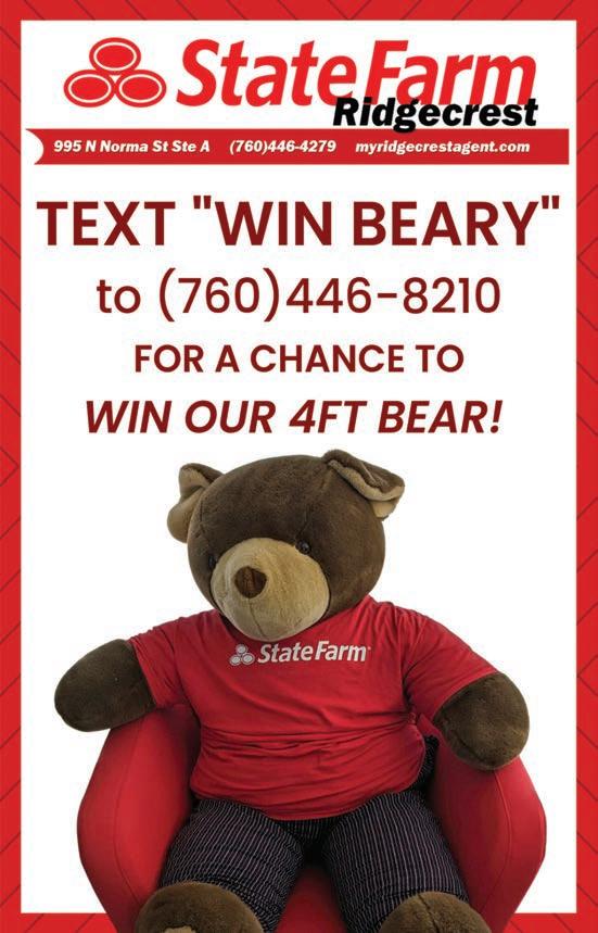 1-760-301-7026. TFN COMMERCIAL KITCHEN REPAIRS. Ovens, stoves, grills, warmers, ice machines, refrigeration. Call Steve 1760-608-7724. 05/25 pAGe 03 THURSDAY, MAY 25, 2023 THe SwAp SHeeT Storage 8x20 - $80 p/mo Storage 8x40 - $125 p/mo Most reasonable rates in town. Reasons why to store at RHB Storage: More space for less money Rates don’t jump around Yearly payment discount available 1-760-375-7727 667 S. Richmond Rd. Unit E., Ridgecrest A&L Tire Service Center and We’re More Than Just A Tire Store... We’re Your Complete Automotive Service Center! • FREE Shuttle Service For Customers Convenience • 24 Hour Roadside Tire Service For Any Vehicle • FREE Vehicle Safety Inspections • Full A/C Service • Napa Care Center • We Offer The Best Nationwide Road Hazard Warranty In Town • Newest State Of The Art Tire Pressure Monitor System Diagnosis With Some Of The Most Affordable Sensors In Town • Only Shop In Town That Has A Wide Variety Of American Made Tires In Stock Hablamos Español 317 West Inyokern Road • www.AandLTire.com (760) 499-MIKE OPEN SATURDAYS! A/C SYSTEM INSPECTION $69 most vehicles LOOK RO S Car Flex Fr e re We W OBERTJWHITING COTT E. WHITING, D ing, Personalized Dent e’r ridays! NG ON GAS DDS DS ental PPO. ces, ITE C istry! GENCIES Open ROOT CANALS • TEETH WHITENI SEDATI • ORAL SURGERY ORAL NITROUS/LAUGHING IMPLANTS • EMER TAAL Y COSMETIC DENTISTR Y CHILDREN’S DENTISTR ROBERT J. WHITING, Delta D All Base Dental Plans and Including Are in Network with Most Insuran We 760-375-6999 . • SUI T. 841 N. DOWNS ST • DENT .whitingfamily Email: wfdridgecrest@yahoo.com • www dental.com 117 E. Ridgecrest Blvd. Ridgecrest, CA 93555 760-463-1297 • Great Food designed for the family! • Priced right • Food specials! Watch the sports games and enjoy the food and drinks! electricity windows/doors roof tile plumbing paint patios/decks additions flooring. framing