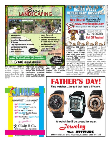 LINX FOUR wHEEL scooter $600. New batter30# NUTRO NATURAL ies, good condition. 1choice dog food lamb & 760-377-4053. 06/12 NO CREDIT NEEDED PROTECT YOURSELF ** YARD SALE: rice $44.99. Buy 10 bags FURNITURE at EZ Rentals! Rent AND your property, 6TH/ 7th, 9:00am- get 1 free ask us how at PATIO FOR Sale: 7 piece, new washer, dryers, TV, always hire a licensed 2:00pm. 700 S. Silver Gateway Hardware in stereos, furniture. We contractor. Cardinal Ridge #115. 06/05 Inyokern. Open 7 days a cushions $150.00. 1-760375-6300. 06/05 rent for less, do the math. Plumbing 1-760-446week. 1-760-377-4571. 805 N. China Lake Blvd. 4004, Lic#496447. TFN 06/05