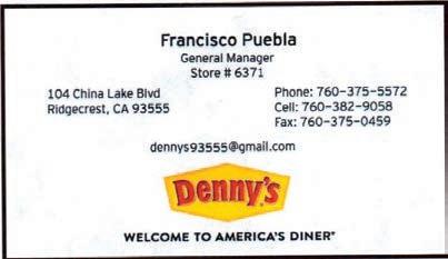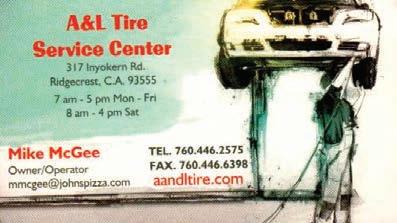 Storage 8x20 - $80 p/mo Storage 8x40 - $125 p/mo Most reasonable rates in town. Reasons why to store at RHB Storage: More space for less money Rates don’t jump around Yearly payment discount available 1-760-375-7727 667 S. Richmond Rd. Unit E., Ridgecrest A&L Tire Service Center and We’re More Than Just A Tire Store... We’re Your Complete Automotive Service Center! • FREE Shuttle Service For Customers Convenience • 24 Hour Roadside Tire Service For Any Vehicle • FREE Vehicle Safety Inspections • Full A/C Service • Napa Care Center • We Offer The Best Nationwide Road Hazard Warranty In Town • Newest State Of The Art Tire Pressure Monitor System Diagnosis With Some Of The Most Affordable Sensors In Town • Only Shop In Town That Has A Wide Variety Of American Made Tires In Stock Hablamos Español 317 West Inyokern Road • www.AandLTire.com (760) 499-MIKE OPEN SATURDAYS! A/C SYSTEM INSPECTION $69 most vehicles LOOK RO S Car Flex Fr e re We W OBERTJWHITING COTT E. WHITING, D ing, Personalized Dent e’r ridays! NG ON GAS DDS DS ental PPO. ces, ITE C istry! GENCIES Open ROOT CANALS • TEETH WHITENI SEDATI • ORAL SURGERY ORAL NITROUS/LAUGHING IMPLANTS • EMER TAAL Y COSMETIC DENTISTR Y CHILDREN’S DENTISTR ROBERT J. WHITING, Delta D All Base Dental Plans and Including Are in Network with Most Insuran We 760-375-6999 . • SUI T. 841 N. DOWNS ST • DENT .whitingfamily Email: wfdridgecrest@yahoo.com • www dental.com 117 E. Ridgecrest Blvd. Ridgecrest, CA 93555 760-463-1297 • Great Food designed for the family! • Priced right • Food specials! Watch the sports games and enjoy the food and drinks! 40 Years Experience!
