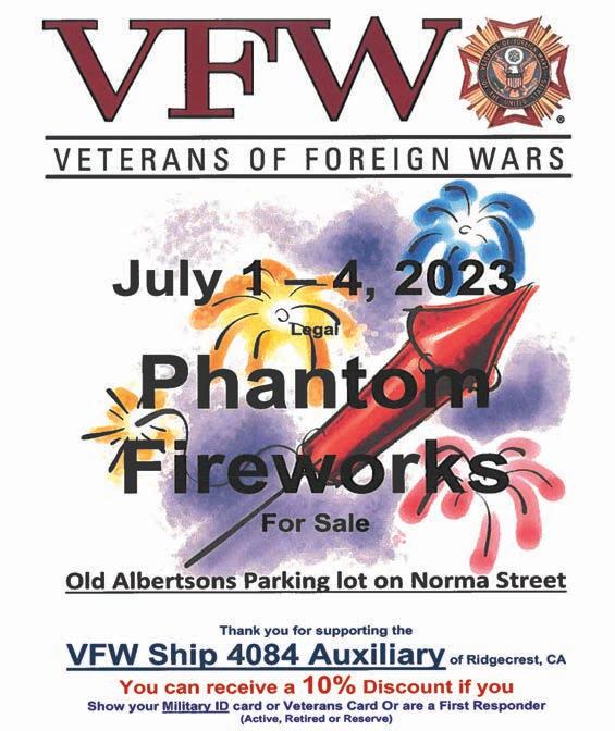 THURSDAY, JUNE 29,. 2023 THE SWAP SHEET PAGE 22 301 W. Ridgecrest Blvd. Ridgecrest, CA 93555 Eagles Aerie 3243 Our thanks to the participants and fo Annual Community Flag P Ridgecrest Lions Clu r their donations rogram b Ae gles Ea rie est, Ridgecr e Ridgecr intere ts If an ested if these this muc y other businesses are ch Thank you . special businesses. call and join with these v needed effort, we invite you ver ou r u t to ry o