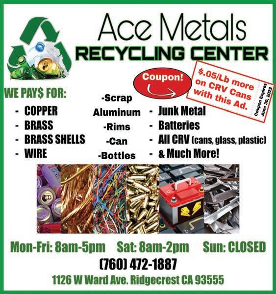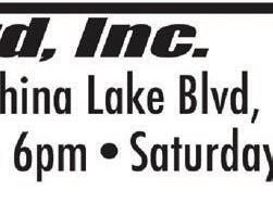 PAGE 03 THURSDAY, JULY 203, 2023 THE SWAP SHEET ** GARAGE SALE: EVERYTHING must go. Friday, Saturday, & Sunday. 10am-? 1440 Porter. 07/20 GETTING HOT... PROTECT yourself! We can help. Todd’s Outdoor Supply. 07/20 CASH PAID FOR complete junk cars. Call for quote. 1-760446-5559. TFN AUGER TRUCK FOR sale. $7,500 with augers (as is). 1-760-446-3300. 07/20 Storage 8x20 - $80 p/mo Storage 8x40 - $125 p/mo Most reasonable rates in town. Reasons why to store at RHB Storage: More space for less money Rates don’t jump around Yearly payment discount available 1-760-375-7727 667 S. Richmond Rd. Unit E., Ridgecrest A&L Tire Service Center and We’re More Than Just A Tire Store... We’re Your Complete Automotive Service Center! • FREE Shuttle Service For Customers Convenience • 24 Hour Roadside Tire Service For Any Vehicle • FREE Vehicle Safety Inspections • Full A/C Service • Napa Care Center • We Offer The Best Nationwide Road Hazard Warranty In Town • Newest State Of The Art Tire Pressure Monitor System Diagnosis With Some Of The Most Affordable Sensors In Town • Only Shop In Town That Has A Wide Variety Of American Made Tires In Stock Hablamos Español 317 West Inyokern Road • www.AandLTire.com (760) 499-MIKE OPEN SATURDAYS! A/C SYSTEM INSPECTION $69 most vehicles LOOK RO S Car Flex Fr e re We W OBERTJWHITING COTT E. WHITING, D ing, Personalized Dent e’r ridays! NG ON GAS DDS DS ental PPO. ces, ITE C istry! GENCIES Open ROOT CANALS • TEETH WHITENI SEDATI • ORAL SURGERY ORAL NITROUS/LAUGHING IMPLANTS • EMER TAAL Y COSMETIC DENTISTR Y CHILDREN’S DENTISTR ROBERT J. WHITING, Delta D All Base Dental Plans and Including Are in Network with Most Insuran We 760-375-6999 . • SUI T. 841 N. DOWNS ST • DENT .whitingfamily Email: wfdridgecrest@yahoo.com • www dental.com 117 E. Ridgecrest Blvd. Ridgecrest, CA 93555 760-463-1297 • Great Food designed for the family! • Priced right • Food specials! Watch the sports games and enjoy the food and drinks! PVC Plumbing and Mechanical Inc. 1501 1/2 N. China Lake Blvd. Ridgecrest, Ca License #801369 A, B, C-36, C-10 Bonded and Insured Most experienced plumbers in the valley. Call for all your plumbing needs: water heaters, garbage disposals, toilets, faucets, and bathroom and kitchen remodels. Do not wait for this to happenbut we can fix even that! Proud member of The Ridgecrest Chamber of Commerce tinabuck.pvc@gmail.com
