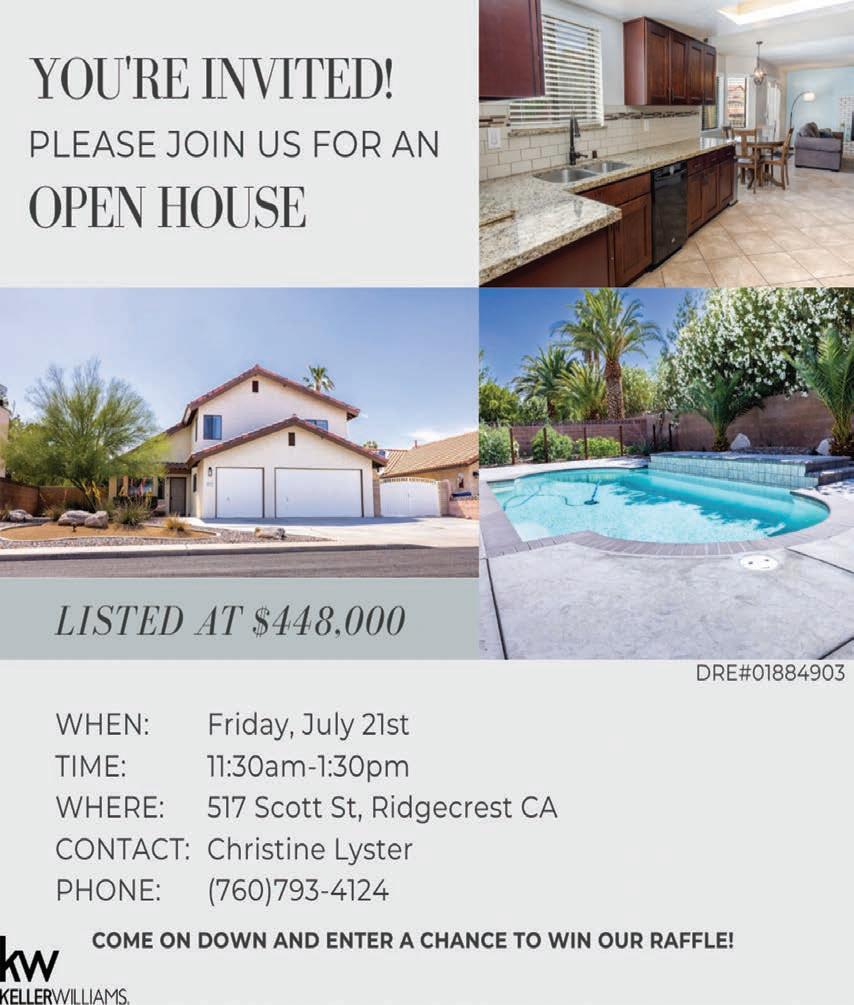 PAGE 07 THURSDAY,JULY 20, 2023 THE SWAP SHEET CONSIDERING BANKRUPTCY? BANKRUPTCY • LIVING TRUSTS POWER OF ATTORNEY FOR FINANCE & HEALTHCARE PRACTICE ESTATE PLANNING • ADOPTIONS * INCORPORATIONS Open Sundays 11:30am - 9:30pm 117 E. Ridgecrest Blvd. TORTA FLAMA TACOS BURRITOS QUESADILLAS AND SO MUCH MOR SCAN THE MENU!