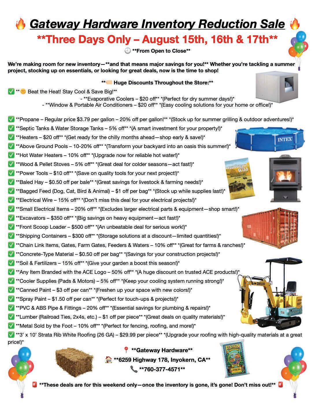 Event coming up quick! October 25th! Mark your calendars! $1.50 off Bagged Feed, $1.50 off Hay & 15% off Tack and Pet Supplies. All day event! Gateway Hardware, 6259 Inyokern Rd. 760377-4571 07/31