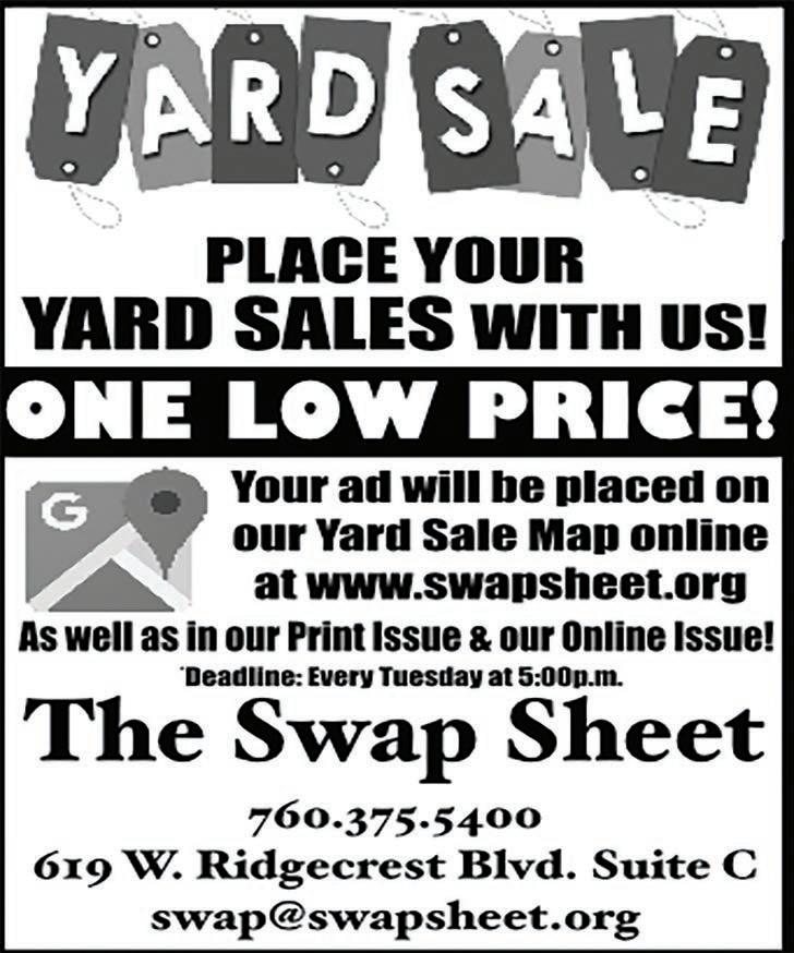 Cutting Bermuda $15.95 while supply lasts! at Gateway Hardware, 6259 Highway 178. 760377-4571. 07/31 PLACE YOUR YARD Sale Classified Ad with us starting at $4.41 for 10 words! Your ad will be online, in print, & on our yard sale map! The Swap Sheet: 760-375-5400. 619 W. Ridgecrest Blvd. Suite C. swap@swapsheet.org. www.swapsheet.org. TFN we DO wINDOw & door replacements. A&R Construction. Lic#1024779. 751 S. Richmond Road, Suite G. arconstruc-