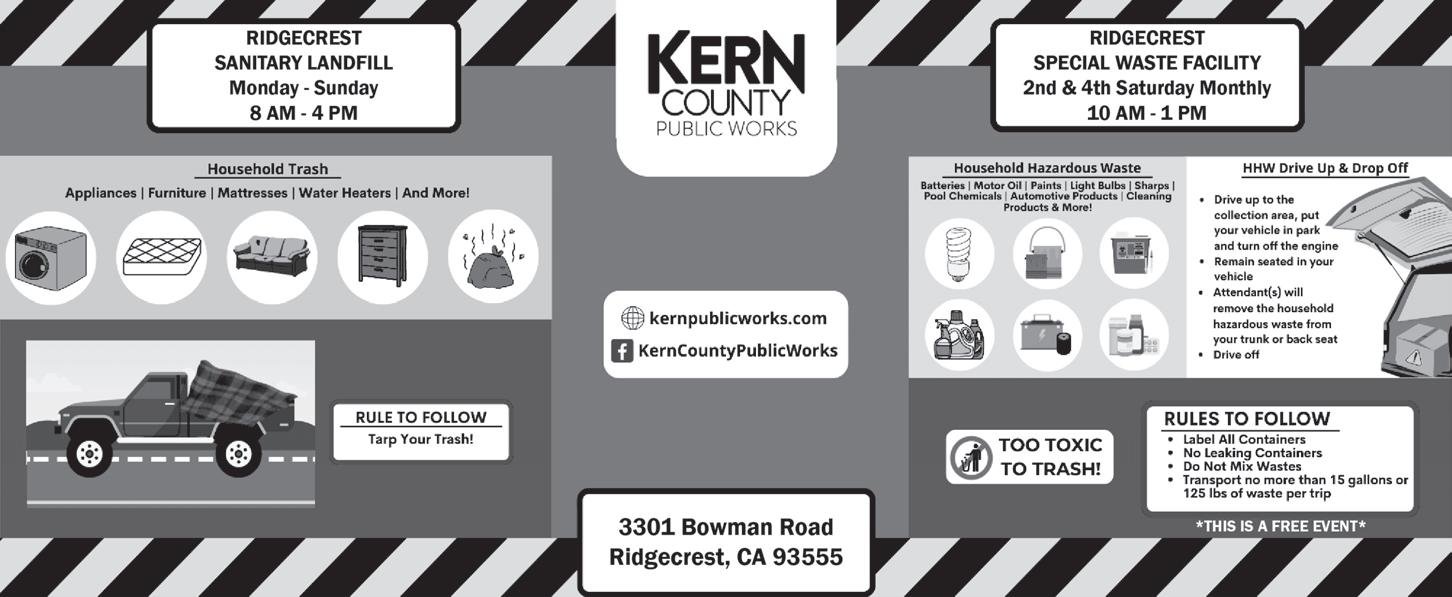 Storage 8x20 - $80 p/mo Storage 8x40 - $125 p/mo Most reasonable rates in town. Reasons why to store at RHB Storage: More space for less money Rates don’t jump around Yearly payment discount available 1-760-375-7727 667 S. Richmond Rd. Unit E., Ridgecrest A&L Tire Service Center and We’re More Than Just A Tire Store... We’re Your Complete Automotive Service Center! • FREE Shuttle Service For Customers Convenience • 24 Hour Roadside Tire Service For Any Vehicle • FREE Vehicle Safety Inspections • Full A/C Service • Napa Care Center • We Offer The Best Nationwide Road Hazard Warranty In Town • Newest State Of The Art Tire Pressure Monitor System Diagnosis With Some Of The Most Affordable Sensors In Town • Only Shop In Town That Has A Wide Variety Of American Made Tires In Stock Hablamos Español 317 West Inyokern Road • www.AandLTire.com (760) 499-MIKE OPEN SATURDAYS! RO S Car Flex Fr e re We W OBERTJWHITING COTT E. WHITING, D ing, Personalized Dent e’r ridays! NG ON GAS DDS DS ental PPO. ces, ITE C istry! GENCIES Open ROOT CANALS • TEETH WHITENI SEDATI • ORAL SURGERY ORAL NITROUS/LAUGHING IMPLANTS • EMER TAAL Y COSMETIC DENTISTR Y CHILDREN’S DENTISTR ROBERT J. WHITING, Delta D All Base Dental Plans and Including Are in Network with Most Insuran We 760-375-6999 . • SUI T. 841 N. DOWNS ST • DENT .whitingfamily Email: wfdridgecrest@yahoo.com • www dental.com Handyman Services No Job Too Small! LN:225011 Call Bill 760-264-3515 Evaporative Coolers Dump Runs 117 E. Ridgecrest Blvd. Ridgecrest, CA 93555 760-463-1297 • Great Food designed for the family! • Priced right • Food specials! Watch the sports games and enjoy the food and drinks!