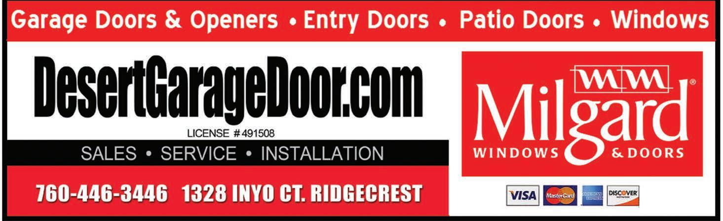 PAGE 03 THURSDAY, AUGUST 17 2023 THE SWAP SHEET IS IT MOLD that’s making you feel sick? I’ll run air tests for you and help you figure out what to do. 1-760-3822195. TFN WE DO WOOD fencing. A&R Construction. Lic# 1024779. 751 S. Richmond Road, Suite G. arconstructionrc.com. 1-760-301-7026. TFN Storage 8x20 - $80 p/mo Storage 8x40 - $125 p/mo Most reasonable rates in town. Reasons why to store at RHB Storage: More space for less money Rates don’t jump around Yearly payment discount available 1-760-375-7727 667 S. Richmond Rd. Unit E., Ridgecrest A&L Tire Service Center and We’re More Than Just A Tire Store... We’re Your Complete Automotive Service Center! • FREE Shuttle Service For Customers Convenience • 24 Hour Roadside Tire Service For Any Vehicle • FREE Vehicle Safety Inspections • Full A/C Service • Napa Care Center • We Offer The Best Nationwide Road Hazard Warranty In Town • Newest State Of The Art Tire Pressure Monitor System Diagnosis With Some Of The Most Affordable Sensors In Town • Only Shop In Town That Has A Wide Variety Of American Made Tires In Stock Hablamos Español 317 West Inyokern Road • www.AandLTire.com (760) 499-MIKE OPEN SATURDAYS! A/C SYSTEM INSPECTION $69 most vehicles LOOK RO S Car Flex Fr e re We W OBERTJWHITING COTT E. WHITING, D ing, Personalized Dent e’r ridays! NG ON GAS DDS DS ental PPO. ces, ITE C istry! GENCIES Open ROOT CANALS • TEETH WHITENI SEDATI • ORAL SURGERY ORAL NITROUS/LAUGHING IMPLANTS • EMER TAAL Y COSMETIC DENTISTR Y CHILDREN’S DENTISTR ROBERT J. WHITING, Delta D All Base Dental Plans and Including Are in Network with Most Insuran We 760-375-6999 . • SUI T. 841 N. DOWNS ST • DENT .whitingfamily Email: wfdridgecrest@yahoo.com • www dental.com 117 E. Ridgecrest Blvd. Ridgecrest, CA 93555 760-463-1297 • Great Food designed for the family! • Priced right! • Food specials! Watch the sports games and enjoy the food and drinks! The very best food, with an extensive menu PVC Plumbing and Mechanical Inc. 1501 1/2 N. China Lake Blvd. Ridgecrest, Ca License #801369 A, B, C-36, C-10 Bonded and Insured Most experienced plumbers in the valley. Call for all your plumbing needs: water heaters, garbage disposals, toilets, faucets, and bathroom and kitchen remodels. Do not wait for this to happenbut we can fix even that! Proud member of The Ridgecrest Chamber of Commerce tinabuck.pvc@gmail.com