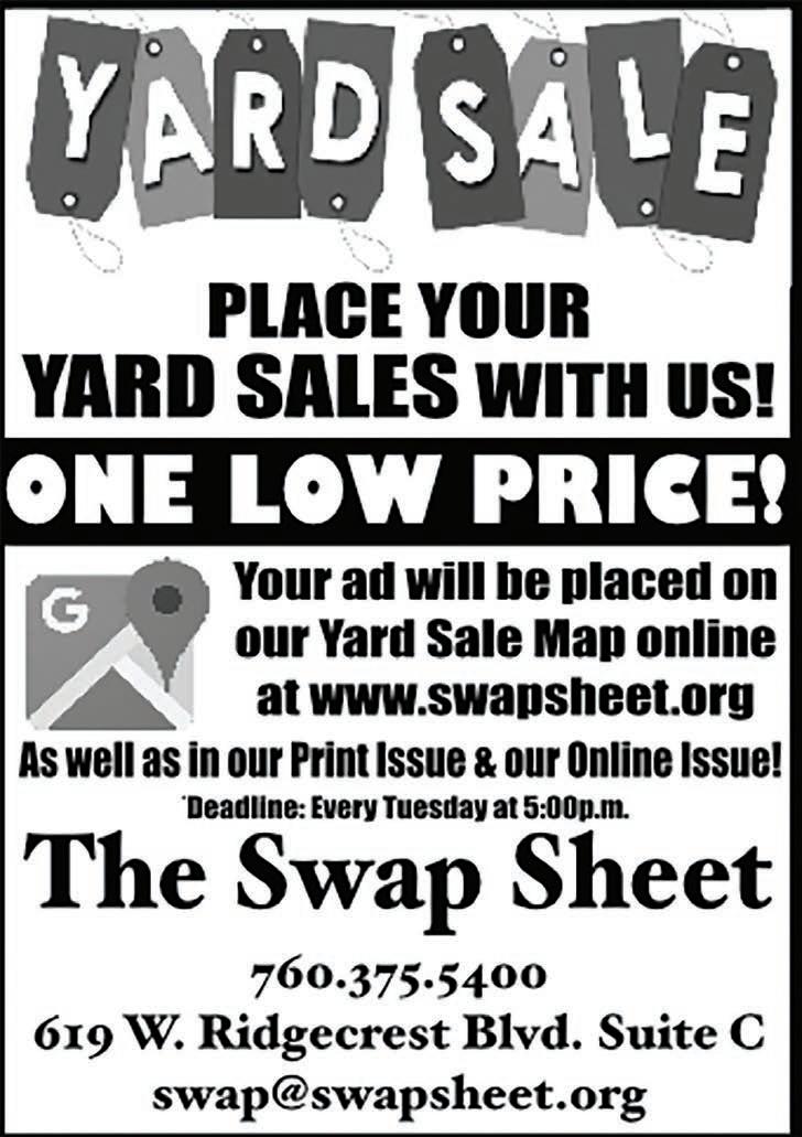 SALE, off of Norma & Coso. 614 W. Coso. Friday & Saturday, 8am to 2pm. Bicycles, generators, miscellaneous tools, swamp