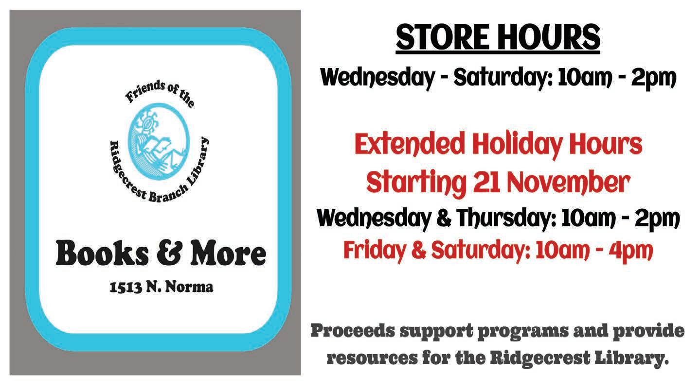 Books! All Children’s and Young Adult books are 25% off for the month of December. That includes new, used, and even some special orders! 206 W Ridgecrest Blvd, Mon-Sat 10-6,