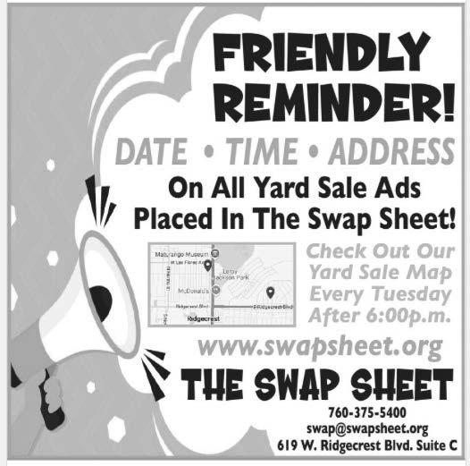 Classified Ad with us starting at $4.41 for 10 words! Your ad will be online, in print, & on our yard sale map! The Swap Sheet: 760-375-5400.