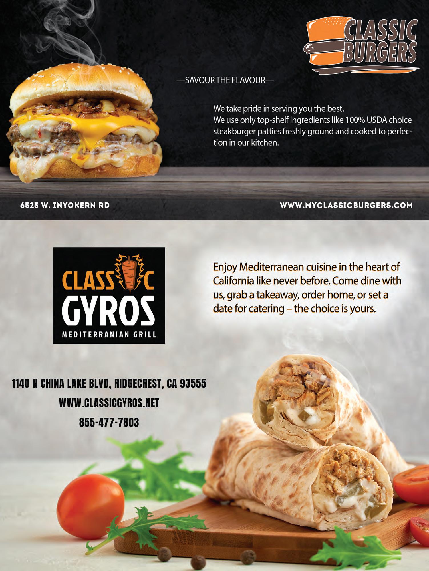 PAGE 2023 - 2024 Casey’sRESTAURANT Locally Owned and Family Operated Casey's Restaurant serves a variety of fresh food including Certified Angus Beef Steaks, Hickory Smoked Barbecue, outstanding Burgers, Salads, make your own Pastas, and more. 760-446-9260 1337 N. China Lake Blvd. FRIDAY NIGHTS! Delicious Cocktails! Prime Rib Dinner 4:00P.M. TILL IT’S GONE! OPEN 11:00A.M. CLOSED: MONDAYS Ask us about our catering services!