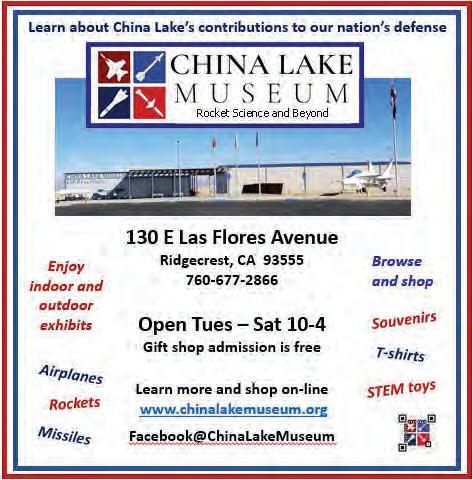 PAGE 6 2023 - 2024 Visit Ridgecrest’s Historic USO Building 760-375-8456 or visit HSUMD.org 230 W. Ridgecrest Blvd., Ridgecrest, CA 93555 Tourist Information • Historical Displays Veterans Memorial Building Guest Lectures • Field Trips Free Movie Nights • Concerts • Open Mic Night• Home of the Historical Society of the Upper Mojave Desert Gift Shop Hours Wed. - Sat. 11am - 3pm Building Available for Rentals