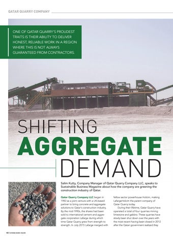 Qatar Quarry Company LLC began in 1983 as a joint venture with a UK-based partner to bring concrete and aggregate solutions to Qatar's construction industry. By the mid-1990s, the shares had been sold to international cement and aggregate corporation Lafarge during which time Qatar Quarry grew from strength to strength. In July 2015 Lafarge merged with 42 | SUSTAINABLE BUSINESS MAGAZINE