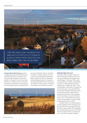MAKING NEW THE OLD In the early 1990s, Innergex were one of the first companies to take up old run-ofriver hydro facilities and bring them back into full usage. "In the early 1990s, small private producers in Quebec were offered contracts to redevelop the small hydro infrastructure,” explains Ms. Privyk. “Then we expanded to other parts of Canada over the next few years. In the early 2000s the Government of Quebec decided to create a wind energy industry and launched a request for proposals of 1000 megawatts, for which Innergex won several contracts. Later, in 2011, we acquired a solar project in Ontario shortly after construction began and brought that online in 2012." At present there is an installed capacity of 1200 megawatts within Innergex's portfolio but their five new projects will raise this total to approximately 1500 megawatts. Four of these projects are run-of-river hydro facilities located in British Columbia and one is a wind farm located in Quebec,